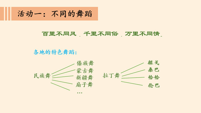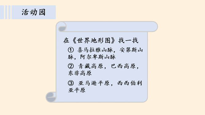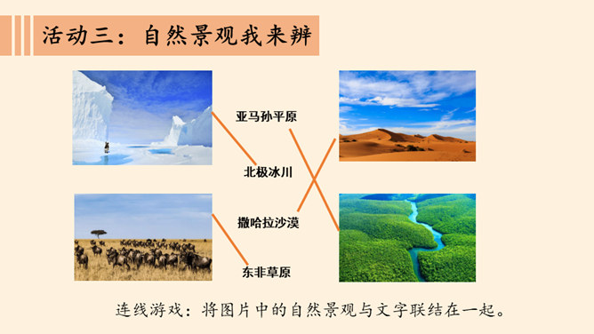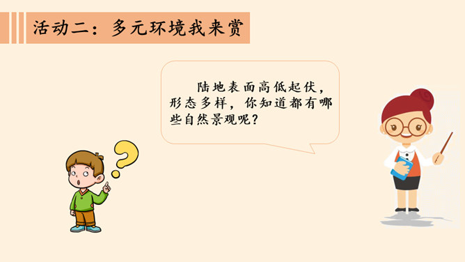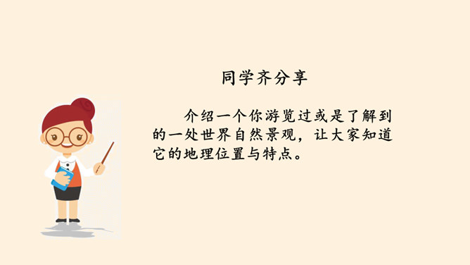 介绍一个你游览过或是了解到的一处世界自然景观,让大家知道它的地理位置与特点。交流分享:你有没有出国旅游的经历?你在旅行过程中了解到他们的什么礼仪?握手:通常年长(尊)者先伸手后,另一方及时呼应。来访时、主人先伸手以表示欢迎。告辞时,待客人先伸手后,主人再相握。握手的力度以不握疼对方的手为限度。初次见面时,时间一般控制在3秒钟内。介绍:介绍时应把身份、地位较为低的一方介绍给相对而言身份、地位较为尊贵的一方。介绍时陈述的时间宜短不宜长,内容直简不宜繁。同时避免给任何一方厚此薄彼的感觉。所属专题:多元文化多样魅力ppt。