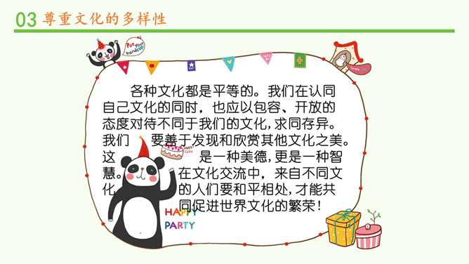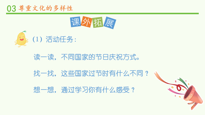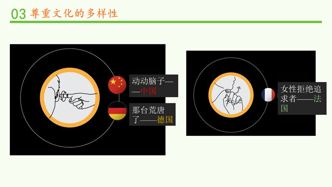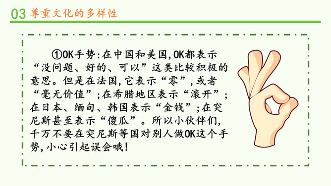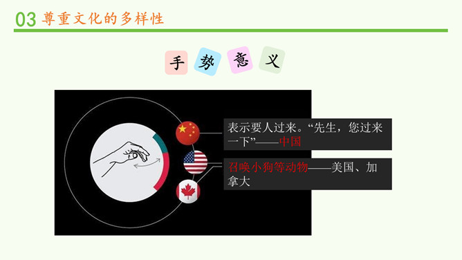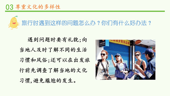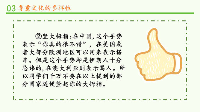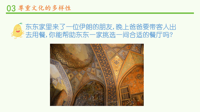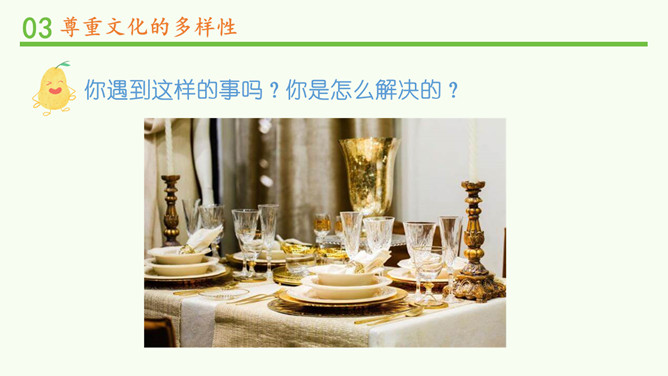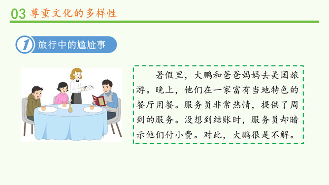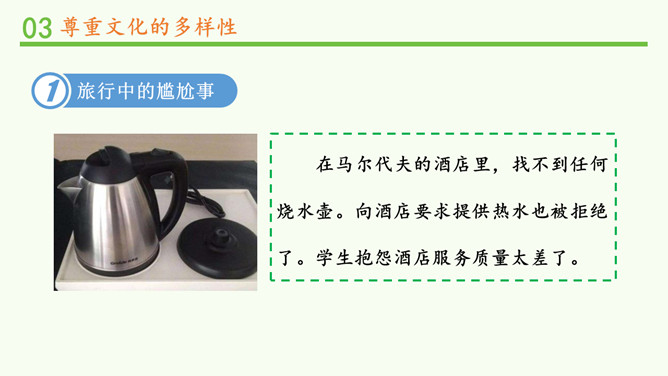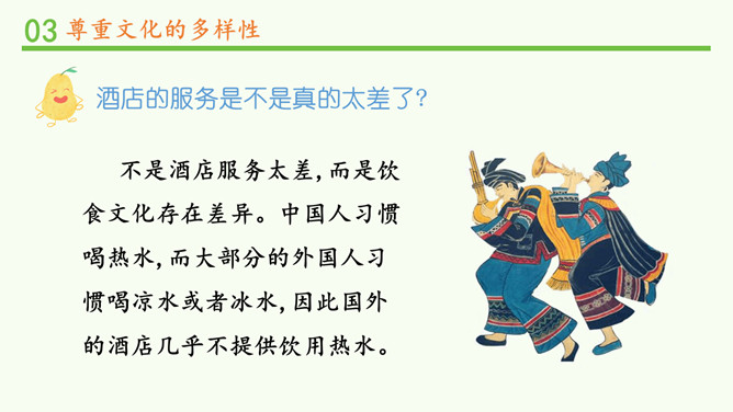 暑假里,大鹏和爸爸妈妈去美国旅游。晚上,他们在一家富有当地特色的餐厅用餐。服务员非常热情,提供了周到的服务。没想到结账时,服务员却暗示他们付小费。对此,大鹏很是不解。在马尔代夫的酒店里,找不到任何烧水壶。向酒店要求提供热水也被拒绝了。学生抱怨酒店服务质量太差了。酒店的服务是不是真的太差了?不是酒店服务太差,而是饮食文化存在差异。中国人习惯喝热水,而大部分的外国人习惯喝凉水或者冰水,因此国外的酒店几乎不提供饮用热水。所属专题:多元文化多样魅力ppt。