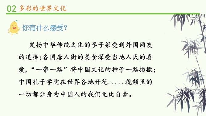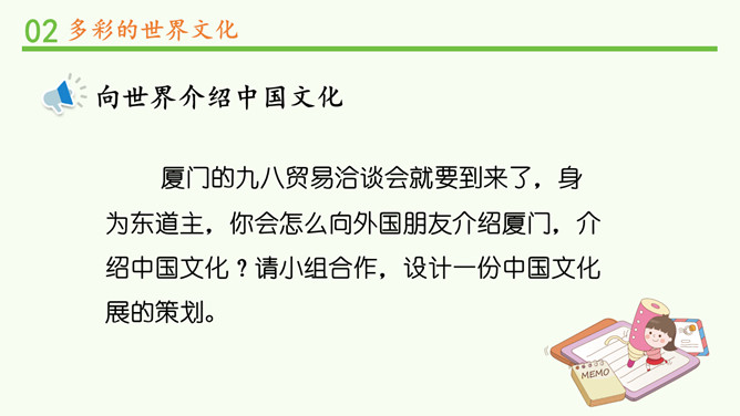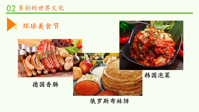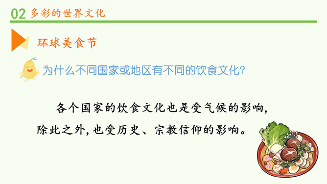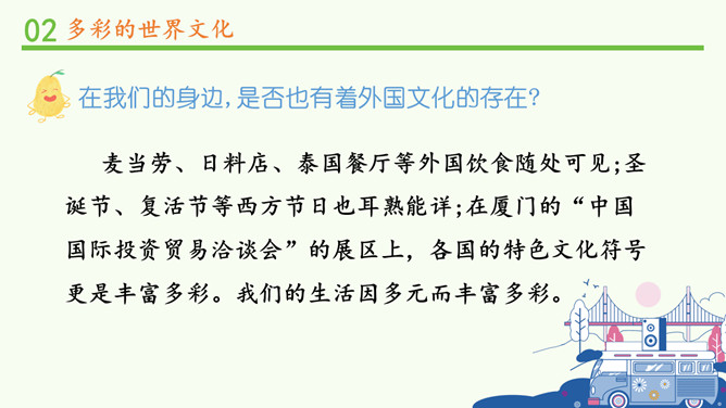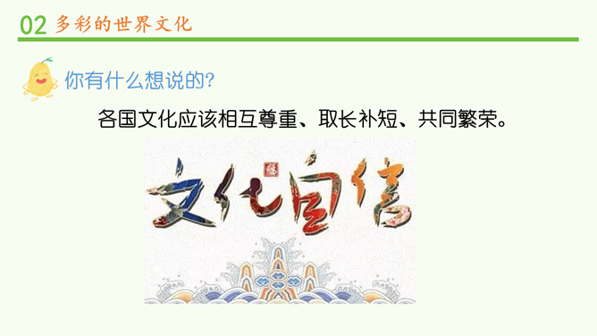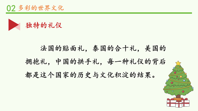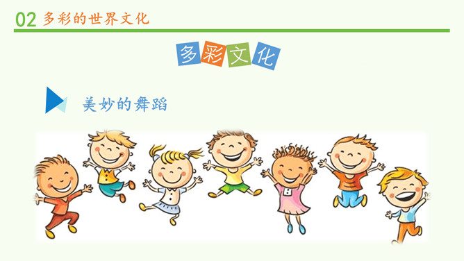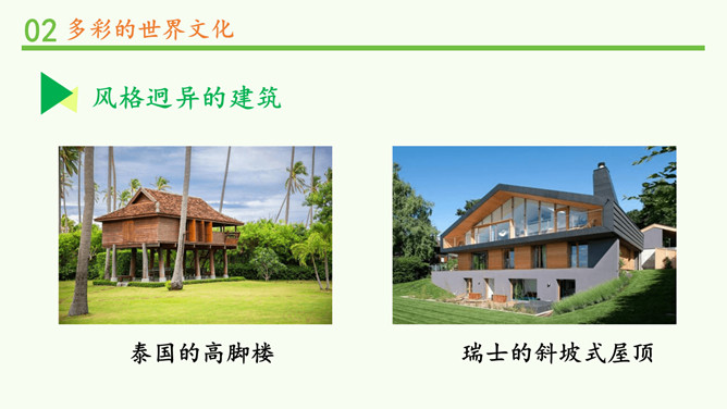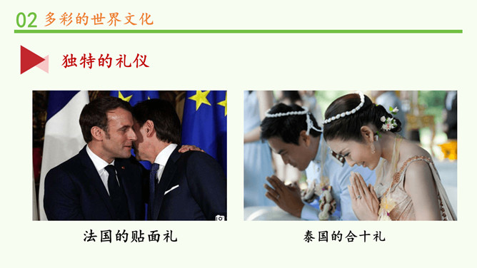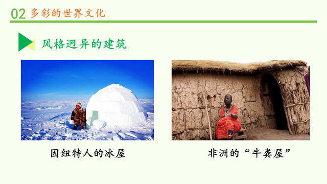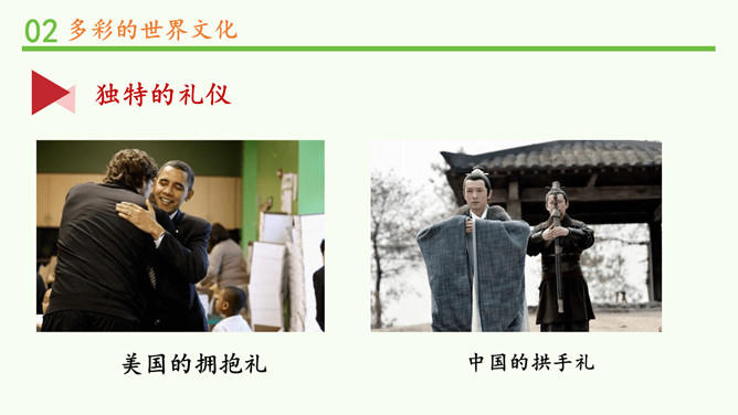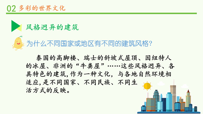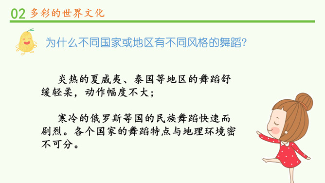 为什么不同国家或地区有不同风格的舞蹈?炎热的夏威夷、泰国等地区的舞蹈舒缓轻柔,动作幅度不大;寒冷的俄罗斯等国的民族舞蹈快速而剧烈。各个国家的舞蹈特点与地理环境密不可分。法国的贴面礼,泰国的合十礼,美国的拥抱礼,中国的拱手礼,每一种礼仪的背后都是这个国家的历史与文化积淀的结果。为什么不同国家或地区有不同的建筑风格?泰国的高脚楼、瑞士的斜坡式屋顶、因纽特人的冰屋、非洲的“牛粪屋”……这些风格迥异、各具特色的建筑,作为一种文化,与各地自然环境相适应,是不同国家、不同民族、不同生活方式的反映。所属专题:多元文化多样魅力ppt。