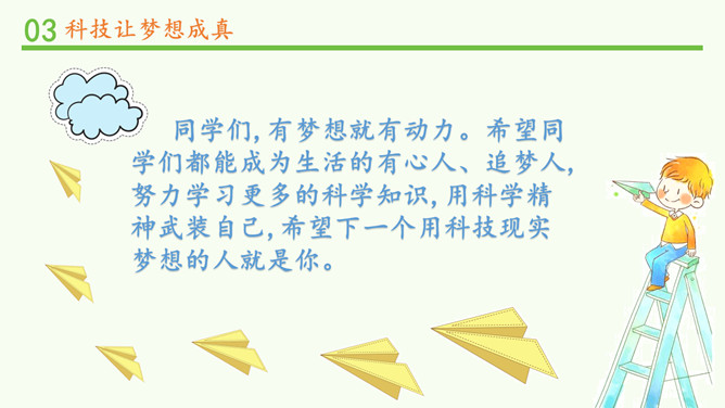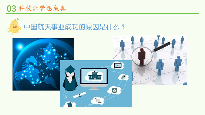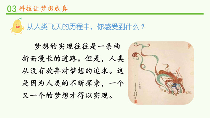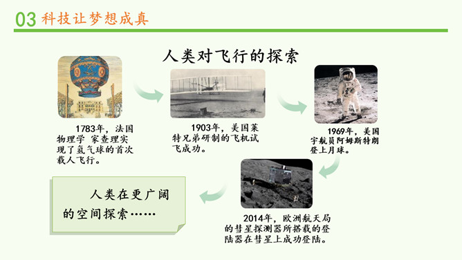 从人类飞天的历程中,你感受到什么?梦想的实现往往是一条曲折而漫长的道路。但是,人类从没有放弃对梦想的追求。这是因为人类的不断探索,一个又一个的梦想才得以实现。同学们,有梦想就有动力。希望同学们都能成为生活的有心人、追梦人,努力学习更多的科学知识,用科学精神武装自己,希望下一个用科技现实梦想的人就是你。所属专题:科技发展造福人类ppt。