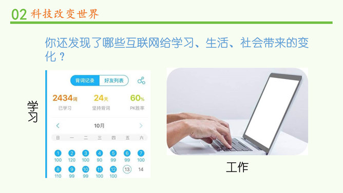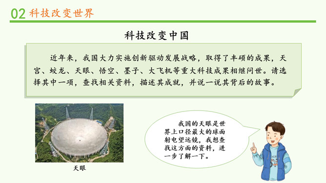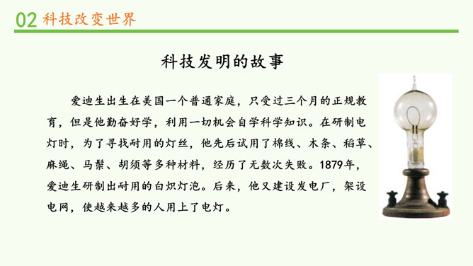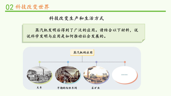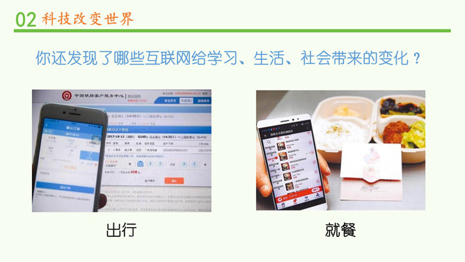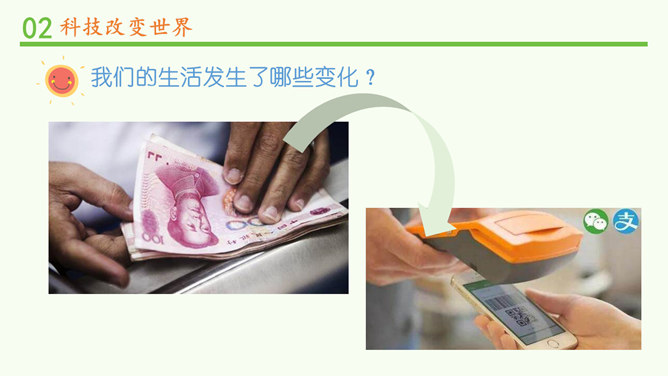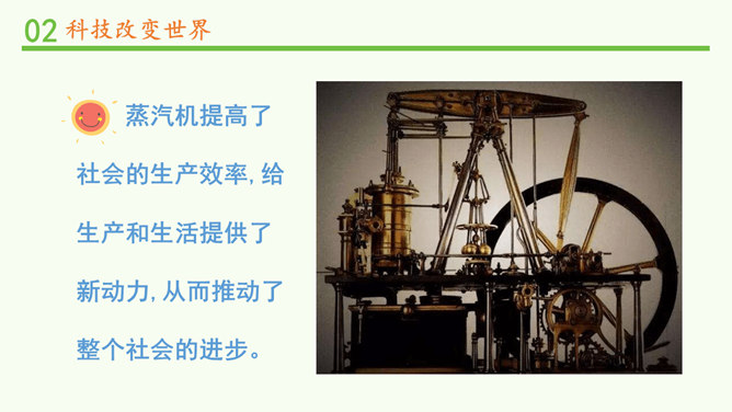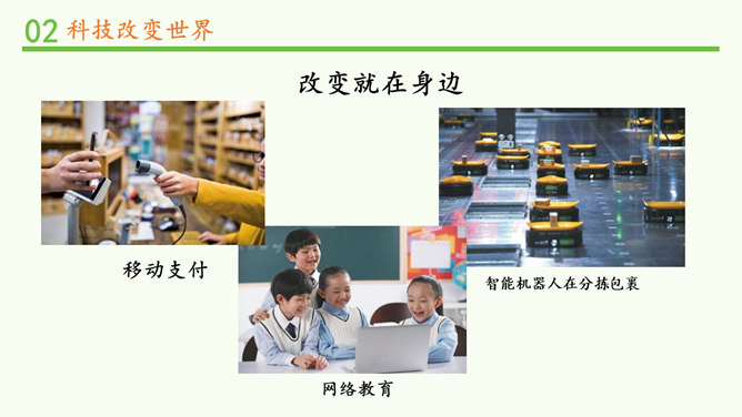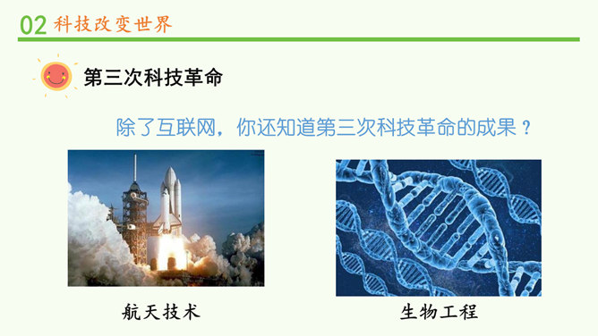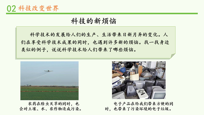 我们的生活发生了哪些变化?你还发现了哪些互联网给学习、生活、社会带来的变化?你还发现了哪些互联网给学习、生活、社会带来的变化?蒸汽机提高了社会的生产效率,给生产和生活提供了新动力,从而推动了整个社会的进步。除了互联网,你还知道第三次科技革命的成果?科学技术的发展给人们的生产、生活带来日新月异的变化。人们在享受科学技术成果的同时,也遇到许多新的烦恼。找一找身边类似的例子,说说科学技术给人们带来了哪些烦恼。电子产品在给我们带来方便的同时,也带来了污染环境的电子垃圾。所属专题:科技发展造福人类ppt。