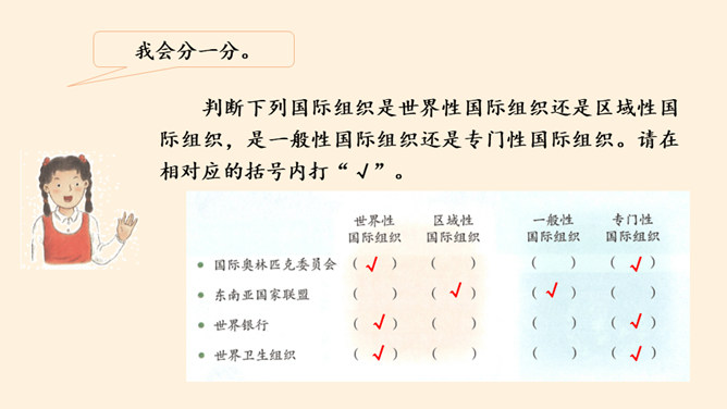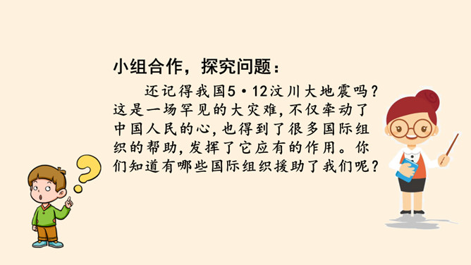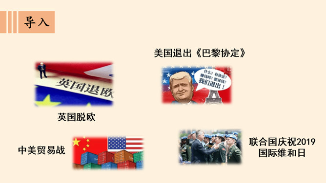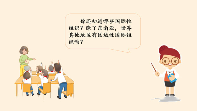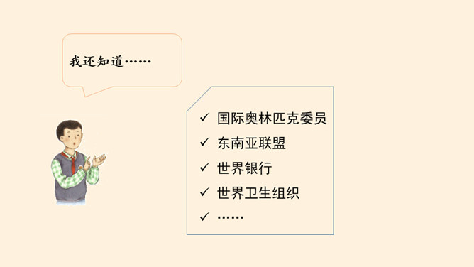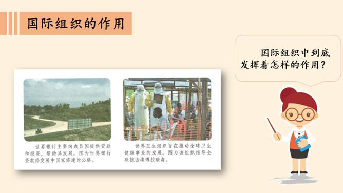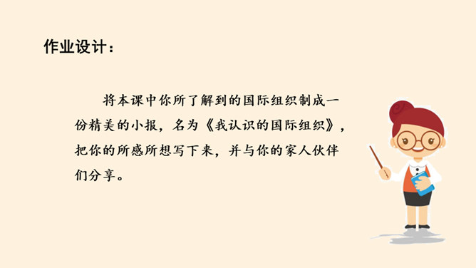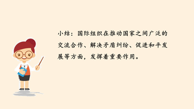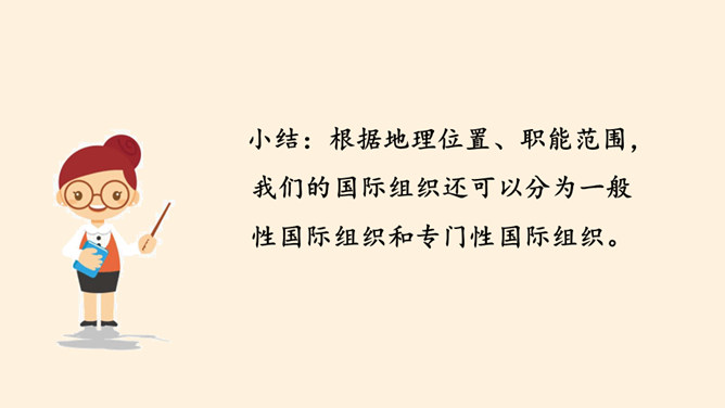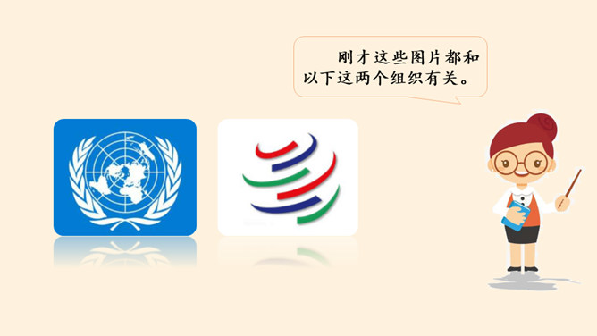 根据地理位置、职能范围,我们的国际组织还可以分为一般性国际组织和专门性国际组织。国际组织在推动国家之间广泛的交流合作、解决矛盾纠纷、促进和平发展等方面,发挥着重要作用。联合国是当代最具普遍性、代表性和权威性的政府间国际组织,在维护世界和平、促进全球发展、增进各国友好等方面发挥着无可替代的作用。世界贸易组织是当代最重要的世界性国际经济组织之一,被称为“经济联合国”,其成员间的贸易额占世界贸易额的绝大多数。课前,我们分别对联合国和世贸组织进行过探究,谁能说说联合国旗帜的含义?所属专题:日益重要的国际组织ppt。