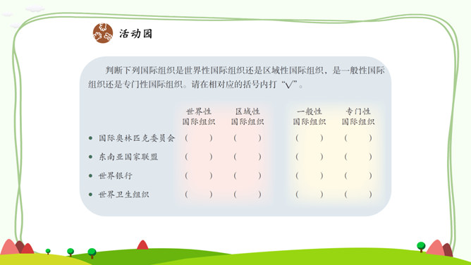中国是联合国创始会员国,参与了联合国的筹建过程。中国是联合国安全理事会常任理事国,在事关和平与安全的重大事务上有关键话语权。中国本着自身肩负的重大国际责任,尊重联合国的权威地位,积极参加各项工作,在人类和平与发展事业中发挥着重要作用。你知道我国还参加了哪些国际组织吗?收集资料,对它们的概况以及我国在其中的作用做一个介绍。中国广泛参加各种国际组织,积极参与多边事务,支持联合国、二十国集团、上海合作组织、金砖国家发挥积极作用,推动国际秩序和国际体系朝着公正合理的方向发展。所属专题:日益重要的国际组织ppt。