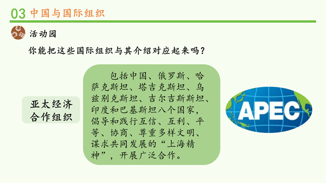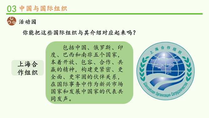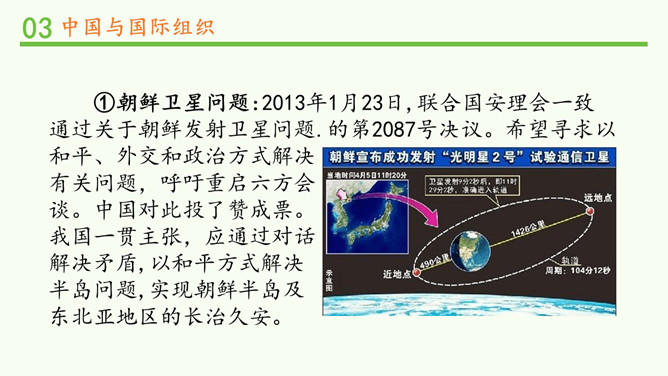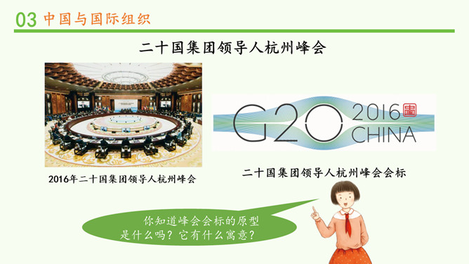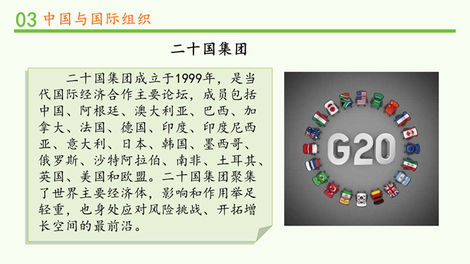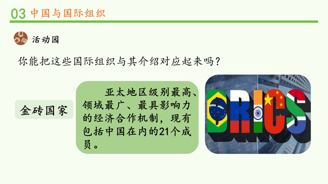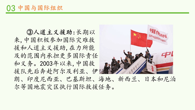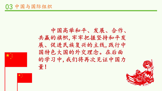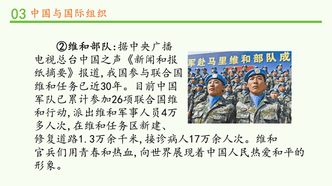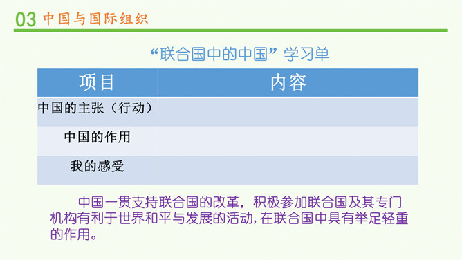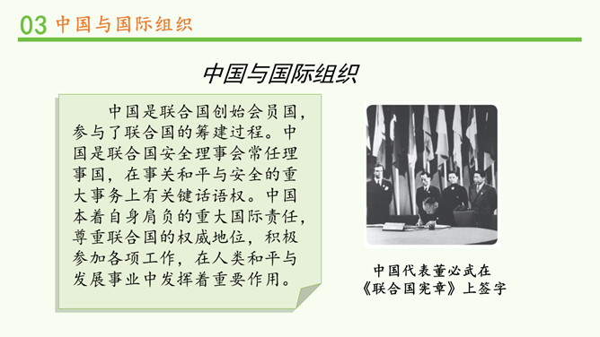中国一贯支持联合国的改革,积极参加联合国及其专门机构有利于世界和平与发展的活动,在联合国中具有举足轻重的作用。中国高举和平、发展、合作、共赢的旗帜,牢牢把握坚持和平发展、促进民族复兴的主线,践行中国特色大国的外交理念。在后面的学习中,我们将再次见证中国力量!所属专题:日益重要的国际组织ppt。