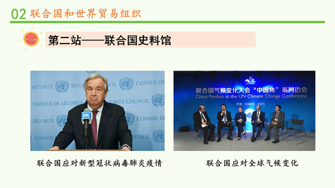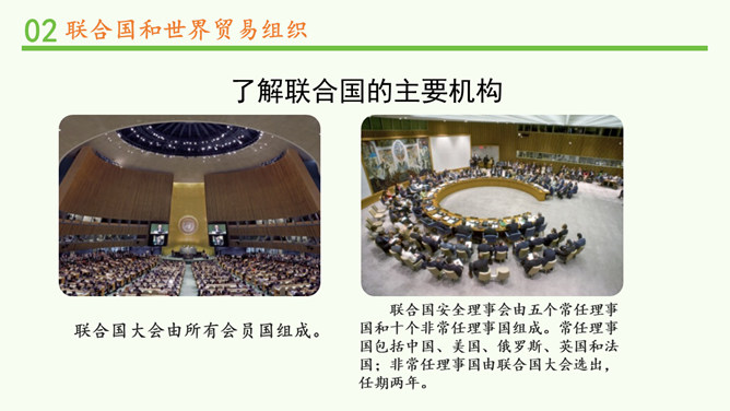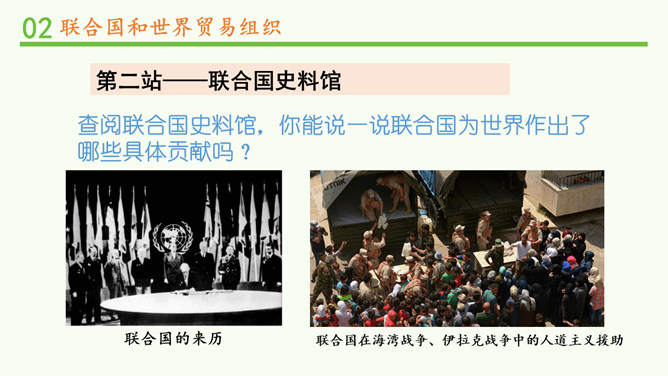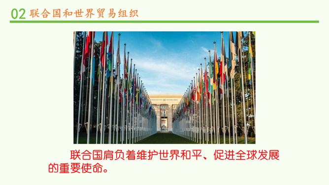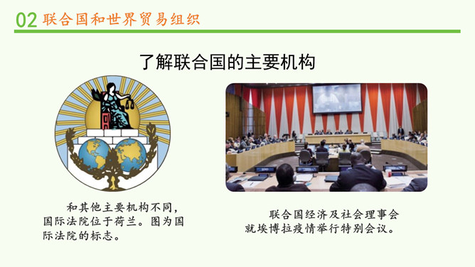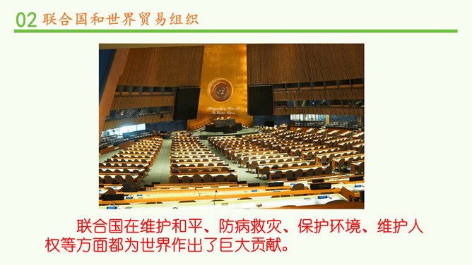 联合国肩负着维护世界和平、促进全球发展的重要使命。查阅联合国史料馆,你能说一说联合国为世界作出了哪些具体贡献吗?联合国在海湾战争、伊拉克战争中的人道主义援助。联合国应对新型冠状病毒肺炎疫情。联合国在维护和平、防病救灾、保护环境、维护人权等方面都为世界作出了巨大贡献。联合国安全理事会由五个常任理事国和十个非常任理事国组成。常任理事国包括中国、美国、俄罗斯、英国和法国;非常任理事国由联合国大会选出,任期两年。和其他主要机构不同,国际法院位于荷兰。图为国际法院的标志。所属专题:日益重要的国际组织ppt。