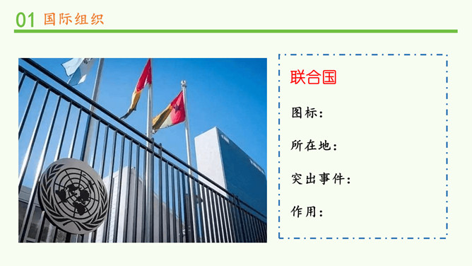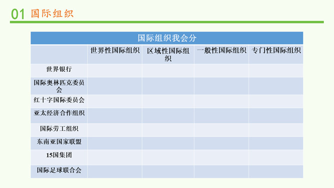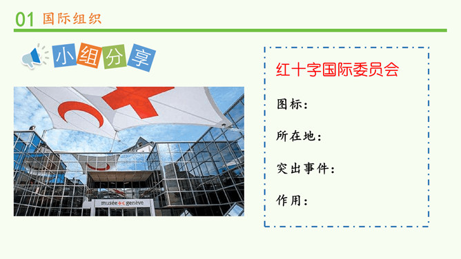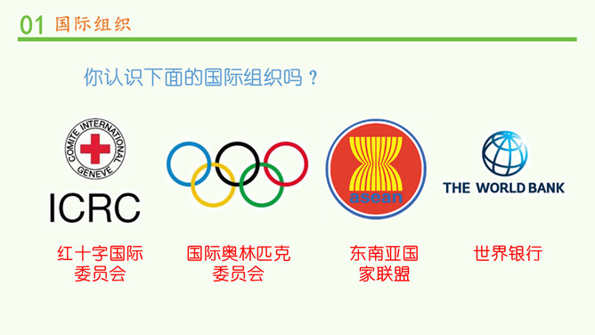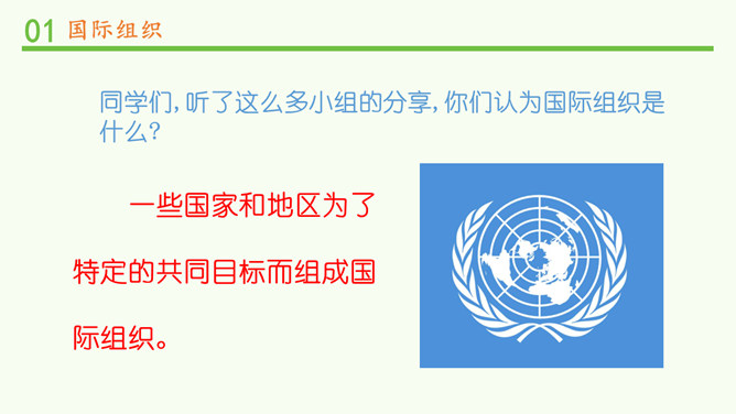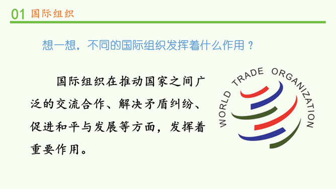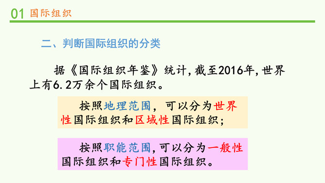 同学们,听了这么多小组的分享,你们认为国际组织是什么?一些国家和地区为了特定的共同目标而组成国际组织。据《国际组织年鉴》统计,截至2016年,世界上有6.2万余个国际组织。按照地理范围,可以分为世界性国际组织和区域性国际组织;按照职能范围,可以分为一般性国际组织和专门性国际组织。想一想,不同的国际组织发挥着什么作用?国际组织在推动国家之间广泛的交流合作、解决矛盾纠纷、促进和平与发展等方面,发挥着重要作用。所属专题:日益重要的国际组织ppt。