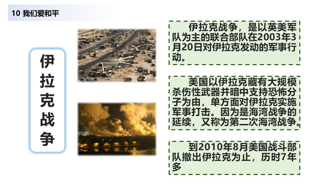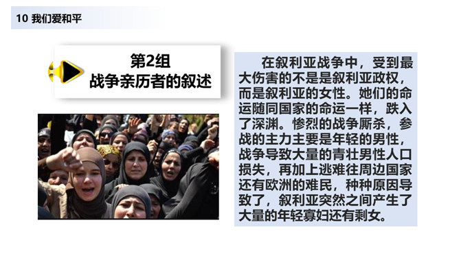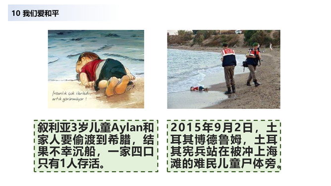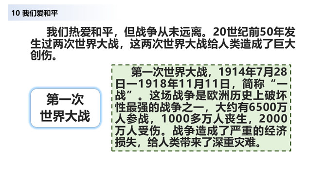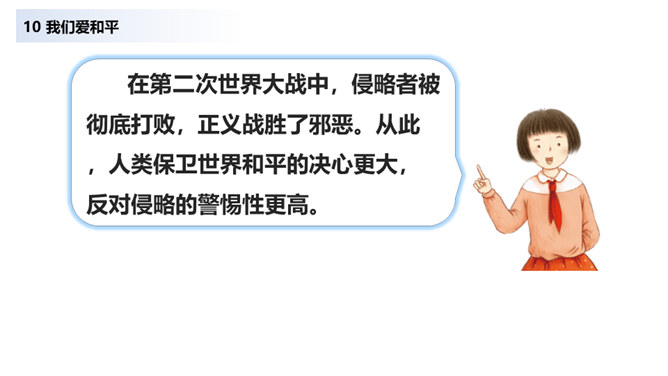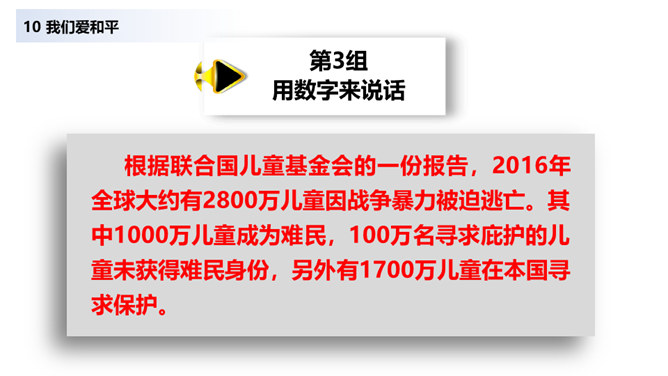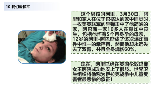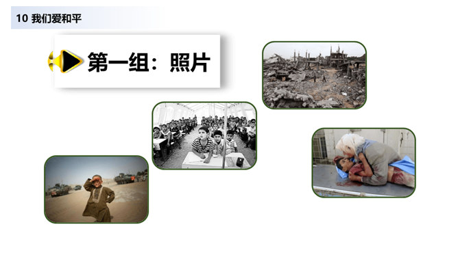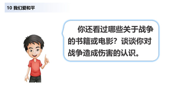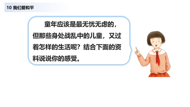 当战争爆发,我们看到的是血流成河,尸横遍野,无数难民流离失所。当战争爆发,硝烟弥漫在原来幸福安定的土地上,死神和悲痛将一起占据了人们的心。在第二次世界大战中,侵略者被彻底打败,正义战胜了邪恶。从此,人类保卫世界和平的决心更大,反对侵略的警惕性更高。童年应该是最无忧无虑的,但那些身处战乱中的儿童,又过着怎样的生活呢?结合下面的资料说说你的感受。你还看过哪些关于战争的书籍或电影?谈谈你对战争造成伤害的认识。随着现代武器不断升级,战争还会给人类带来哪些灾难?对于战争你有什么要说的?
