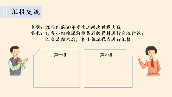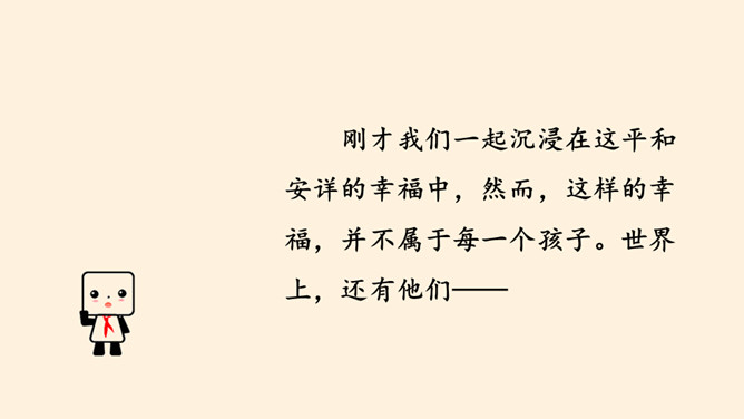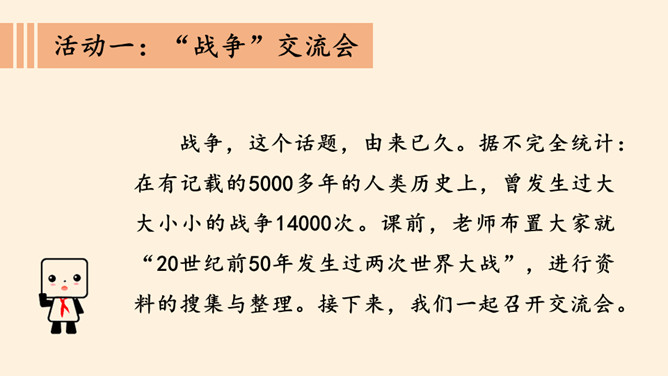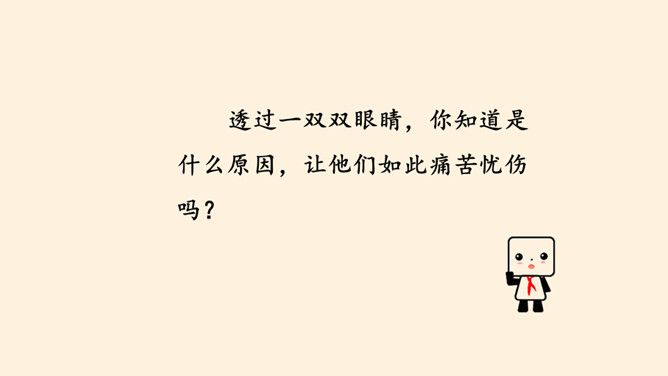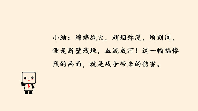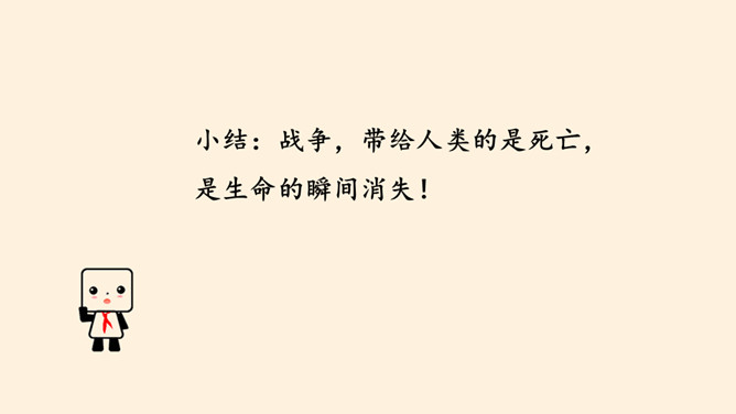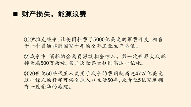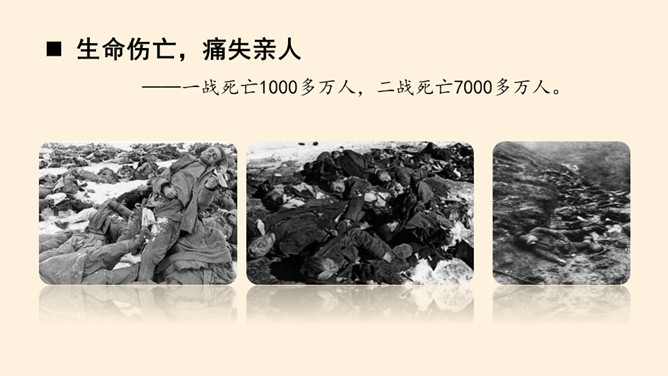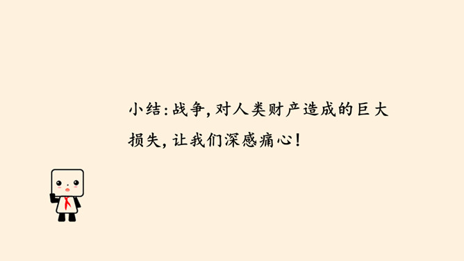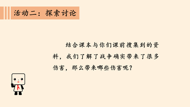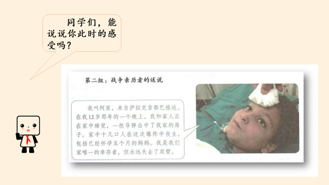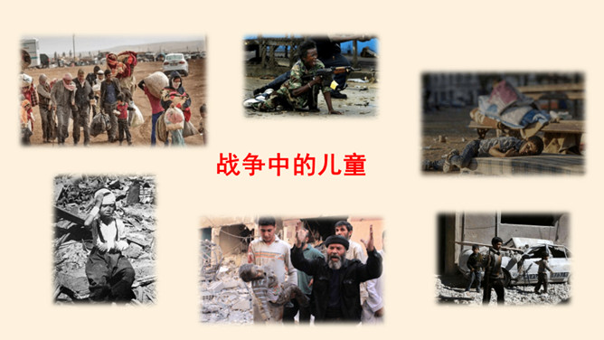 刚才我们一起沉浸在这平和安详的幸福中,然而,这样的幸福,并不属于每一个孩子。世界上,还有他们。透过一双双眼睛,你知道是什么原因,让他们如此痛苦忧伤吗?绵绵战火,硝烟弥漫,顷刻间,便是断壁残垣,血流成河!这一幅幅惨烈的画面,就是战争带来的伤害。结合课本与你们课前搜集到的资料,我们了解了战争确实带来了很多伤害,那么带来哪些伤害呢?战争,带给人类的是死亡,是生命的瞬间消失!战争,对人类财产造成的巨大损失,让我们深感痛心!随着现代武器不断升级,战争还会给人类带来哪些灾难?