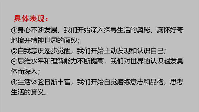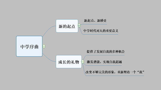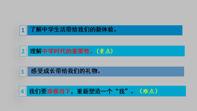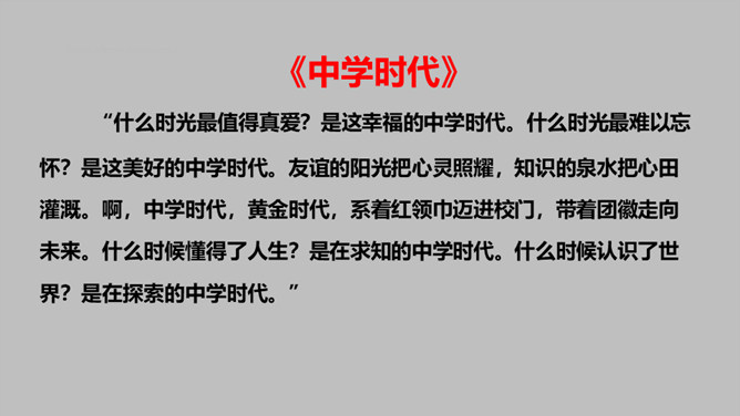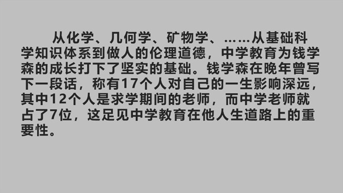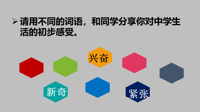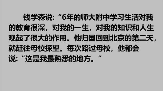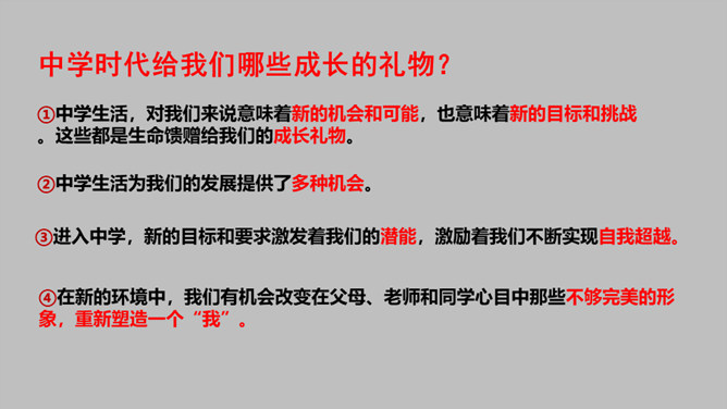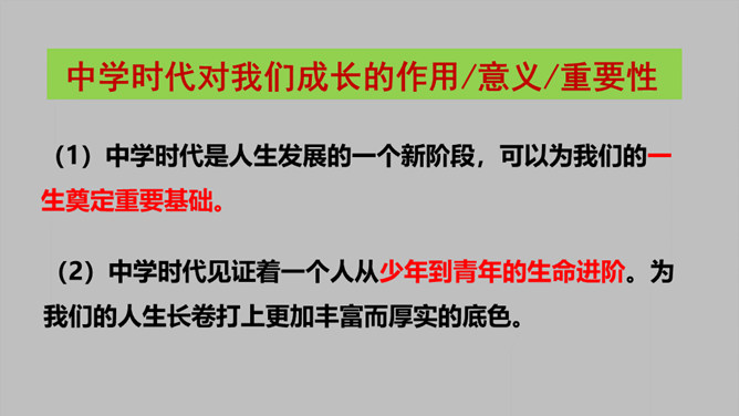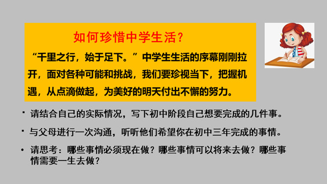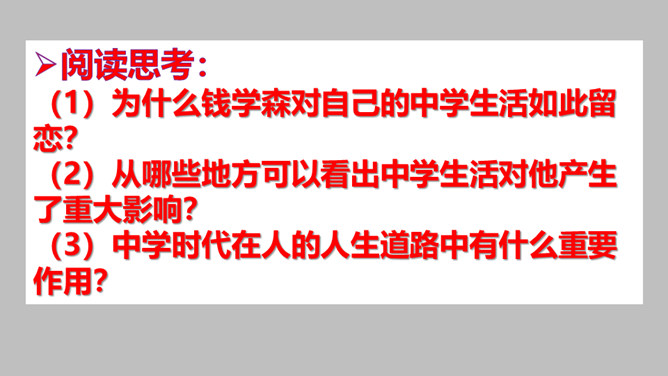 请用不同的词语,和同学分享你对中学生活的初步感受。阅读思考:(1)为什么钱学森对自己的中学生活如此留恋?(2)从哪些地方可以看出中学生活对他产生了重大影响?(3)中学时代在人的人生道路中有什么重要作用?中学时代对我们成长的作用/意义/重要性。(1)中学时代是人生发展的一个新阶段,可以为我们的一生奠定重要基础。(2)中学时代见证着一个人从少年到青年的生命进阶。为我们的人生长卷打上更加丰富而厚实的底色。中学生活,对我们来说意味着新的机会和可能,也意味着新的目标和挑战。这些都是生命馈赠给我们的成长礼物。所属专题:中学序曲ppt。