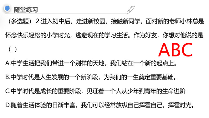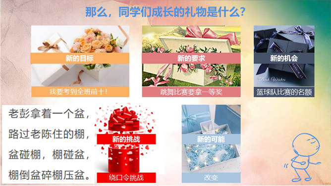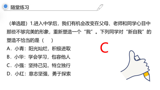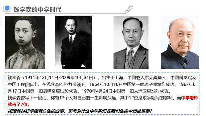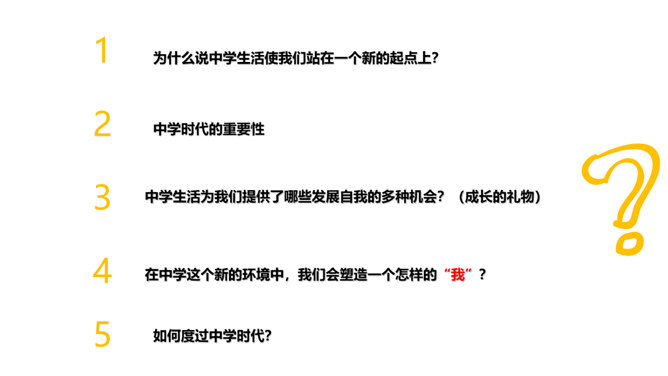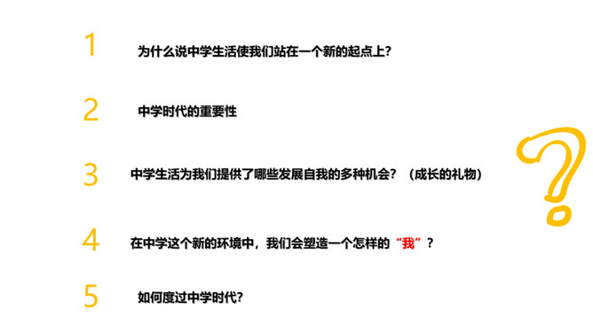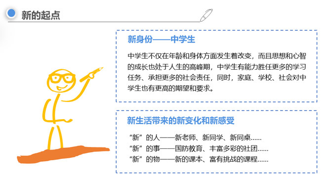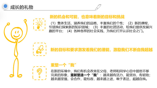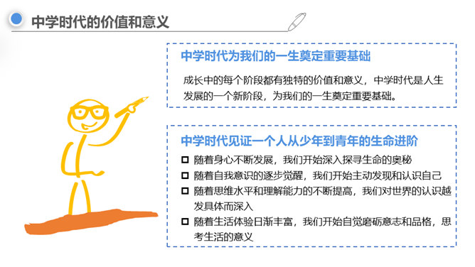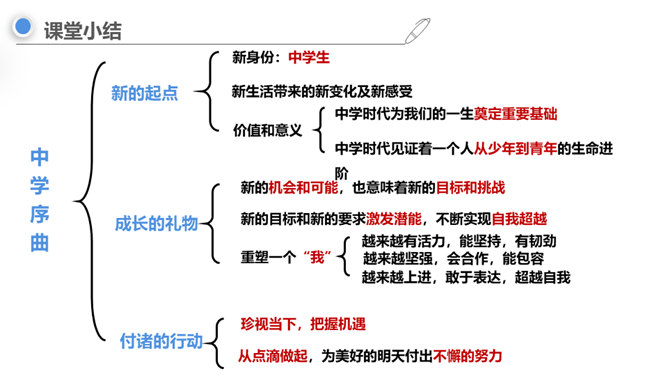 进入初中,对你来说最主要的感受是什么,用一个字来形容?同学们认为“新”在哪里?中学生不仅在年龄和身体方面发生着改变,而且思想和心智的成长也处于人生的高峰期,中学生有能力胜任更多的学习任务、承担更多的社会责任,同时,家庭、学校、社会对中学生也有更高的期望和要求。“新”的人——新老师、新同学、新同桌……“新”的事——国防教育、丰富多彩的社团……“新”的物——新的课本、富有挑战的课程……成长中的每个阶段都有独特的价值和意义,中学时代是人生发展的一个新阶段,为我们的一生奠定重要基础。所属专题:中学序曲ppt。