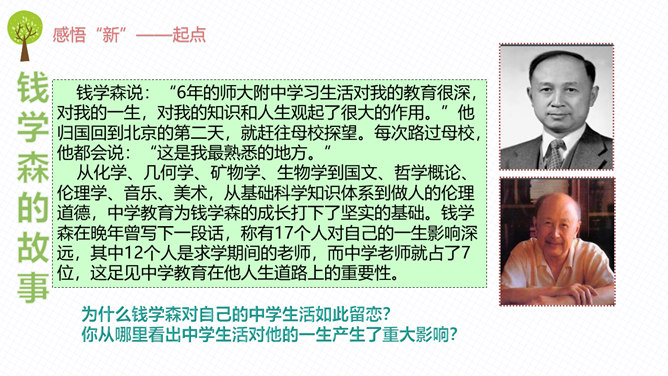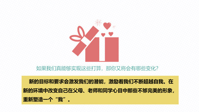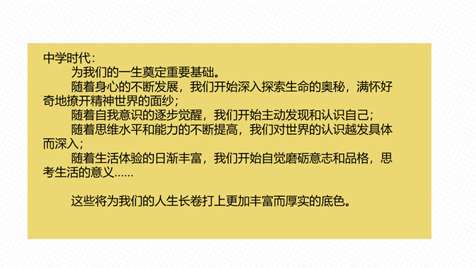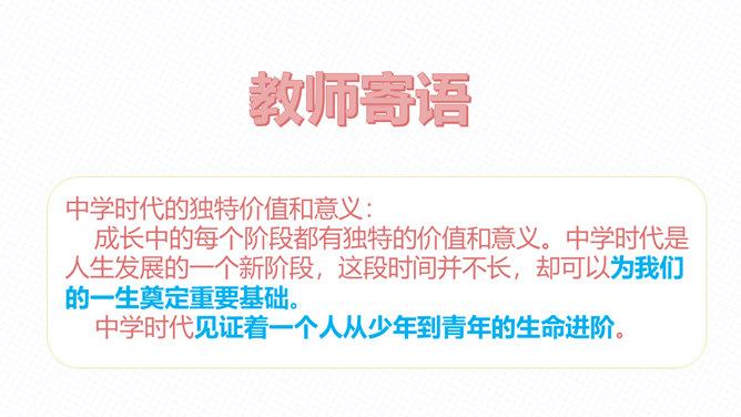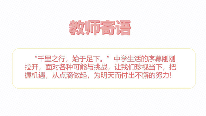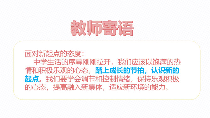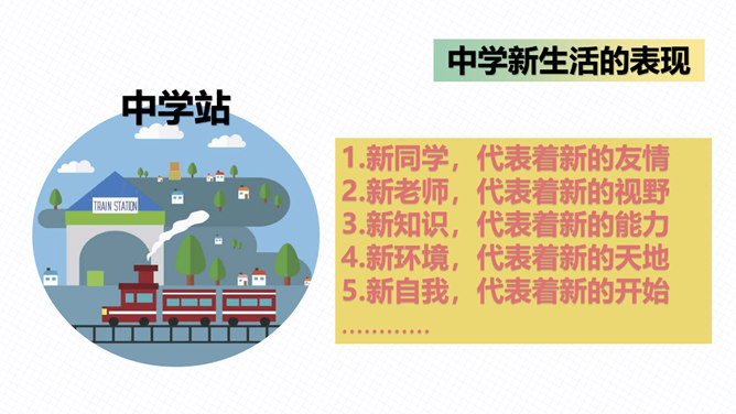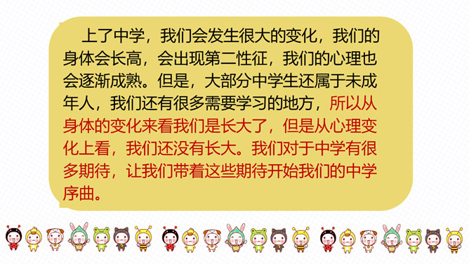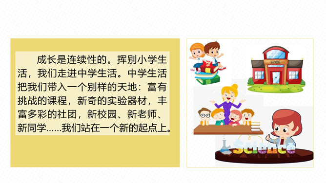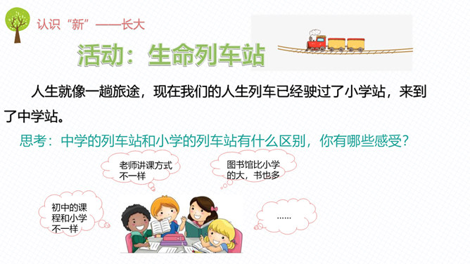 上了中学,我们会发生很大的变化,我们的身体会长高,会出现第二性征,我们的心理也会逐渐成熟。但是,大部分中学生还属于未成年人,我们还有很多需要学习的地方,所以从身体的变化来看我们是长大了,但是从心理变化上看,我们还没有长大。我们对于中学有很多期待,让我们带着这些期待开始我们的中学序曲。人生就像一趟旅途,现在我们的人生列车已经驶过了小学站,来到了中学站。思考:中学的列车站和小学的列车站有什么区别,你有哪些感受?成长是连续性的。挥别小学生活,我们走进中学生活。中学生活把我们带入一个别样的天地。所属专题:中学序曲ppt。