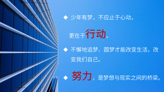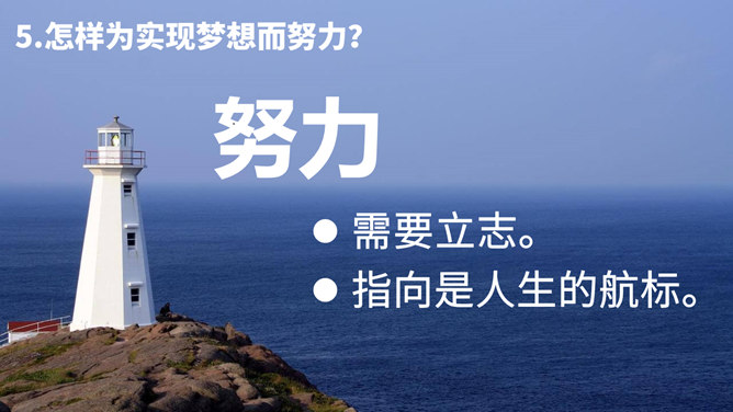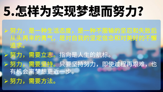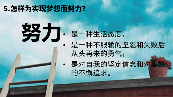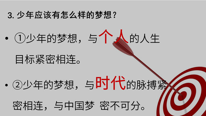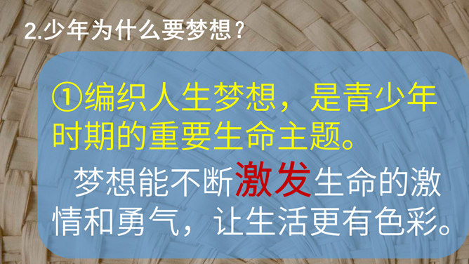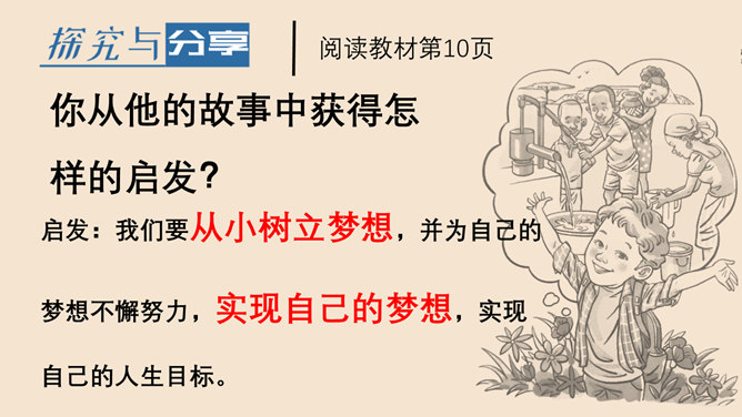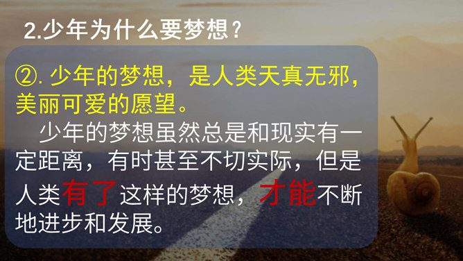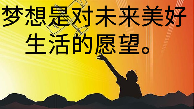 梦想是什么?梦想是对未来美好生活的愿望。少年为什么要有梦想?编织人生梦想,是青少年时期的重要生命主题。梦想能不断激发生命的激情和勇气,让生活更有色彩。少年的梦想,是人类天真无邪,美丽可爱的愿望。少年的梦想虽然总是和现实有一定距离,有时甚至不切实际,但是人类有了这样的梦想,才能不断地进步和发展。你从他的故事中获得怎样的启发?启发:我们要从小树立梦想,并为自己的梦想不懈努力,实现自己的梦想,实现自己的人生目标。少年应该树立怎样梦想?所属专题:少年有梦ppt。