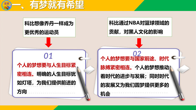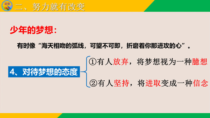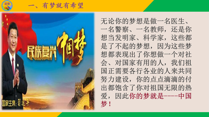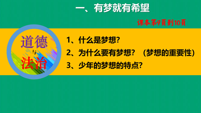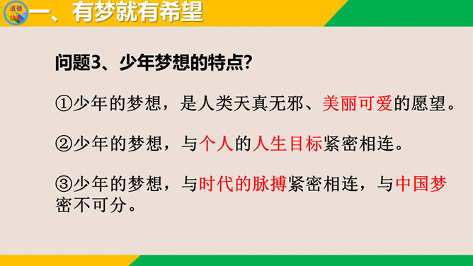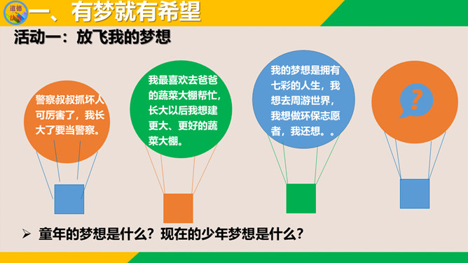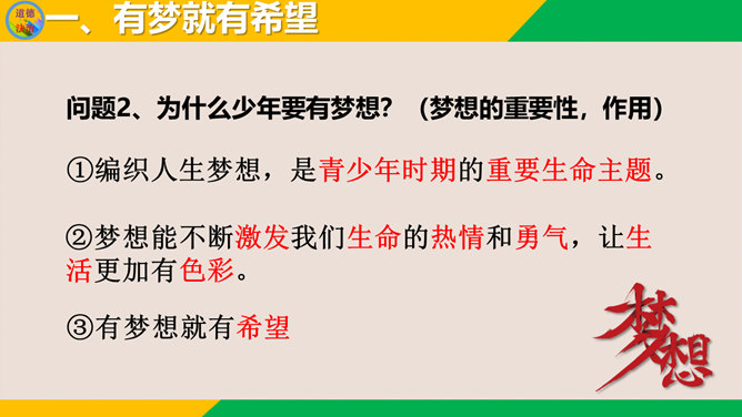 童年的梦想是什么?现在的少年梦想是什么?警察叔叔抓坏人可厉害了,我长大了要当警察。我最喜欢去爸爸的蔬菜大棚帮忙,长大以后我想建更大、更好的蔬菜大棚。我的梦想是拥有七彩的人生,我想去周游世界,我想做环保志愿者,我还想。个人的梦想要与人生目标紧密相连。明确的人生目标犹如灯塔,为我们提供前进的方向。个人的梦想要与国家前途、时代脉搏紧密相连。个人的梦想推动着时代的进步与发展;同时时代的发展又为我们圆梦提供更多的机会。少年的梦想,与时代的脉搏紧密相连,与中国梦密不可分。所属专题:少年有梦ppt。