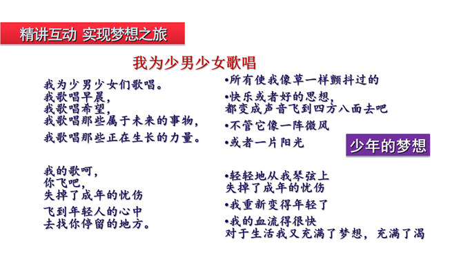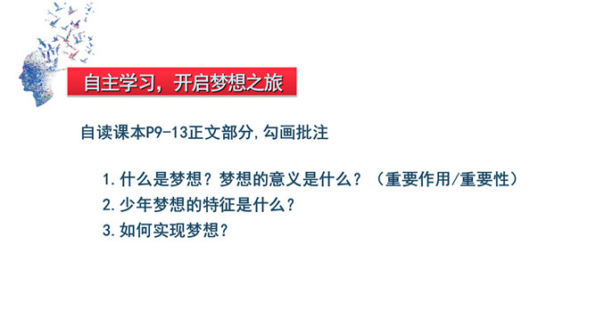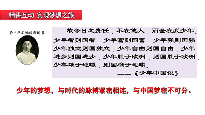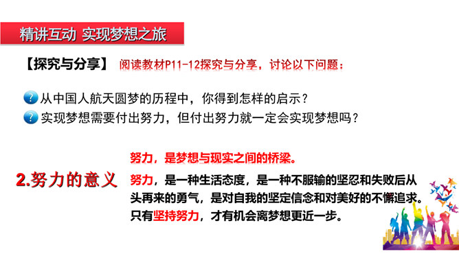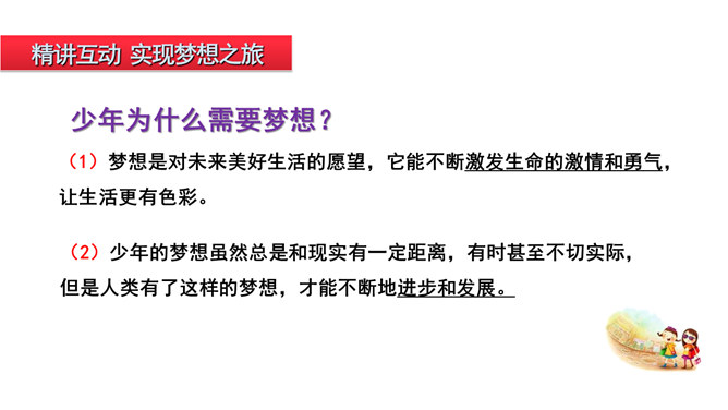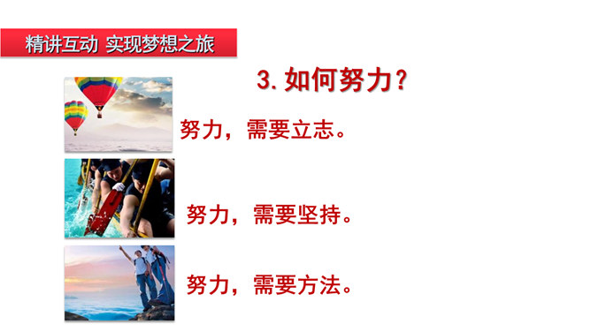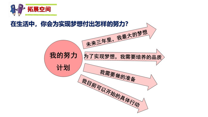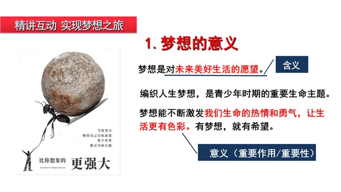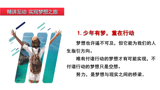 少年有梦,重在行动。梦想也许遥不可及,但它能为我们的人生指引方向。唯有付诸行动的梦想才有可能实现,不付诸行动的梦想只是空想。努力,是梦想与现实之间的桥梁。努力的意义。努力,是梦想与现实之间的桥梁。努力,是一种生活态度,是一种不服输的坚忍和失败后从头再来的勇气,是对自我的坚定信念和对美好的不懈追求。只有坚持努力,才有机会离梦想更近一步。少年的梦想虽然总是和现实有一定距离,有时甚至不切实际,但是人类有了这样的梦想,才能不断地进步和发展。所属专题:少年有梦ppt。