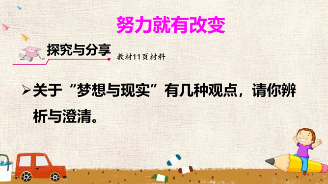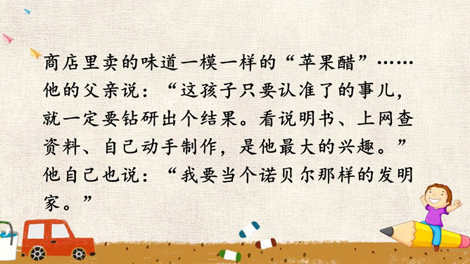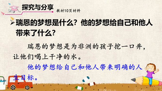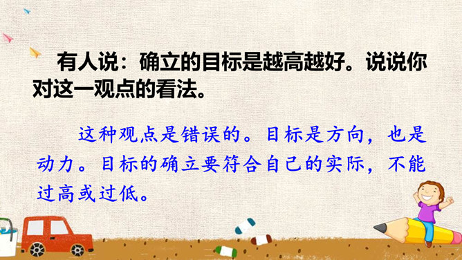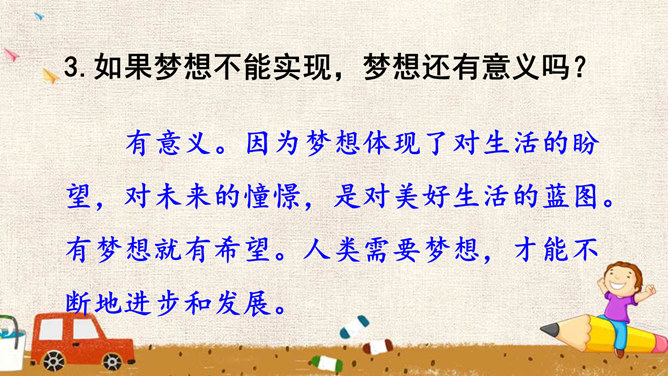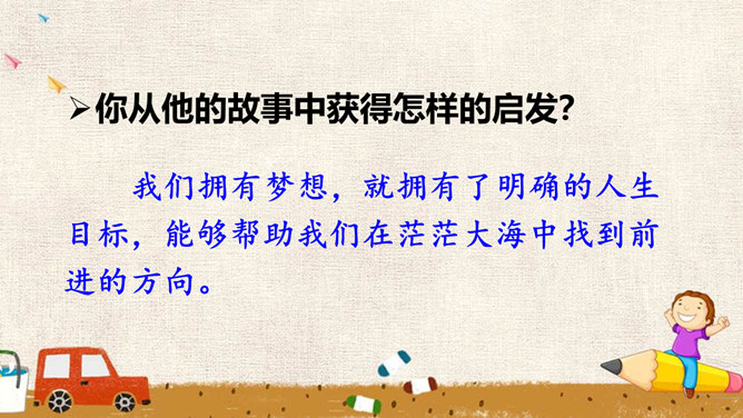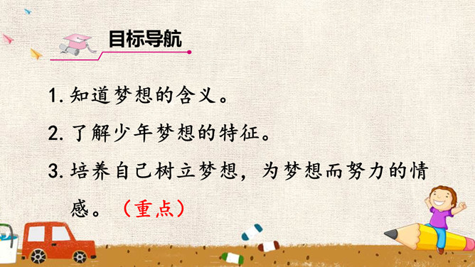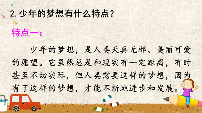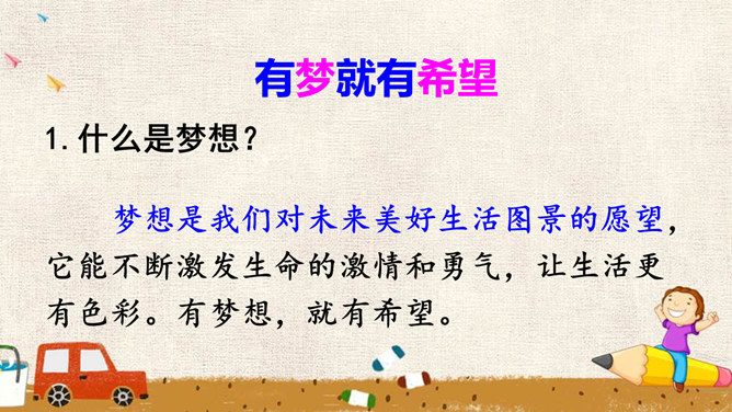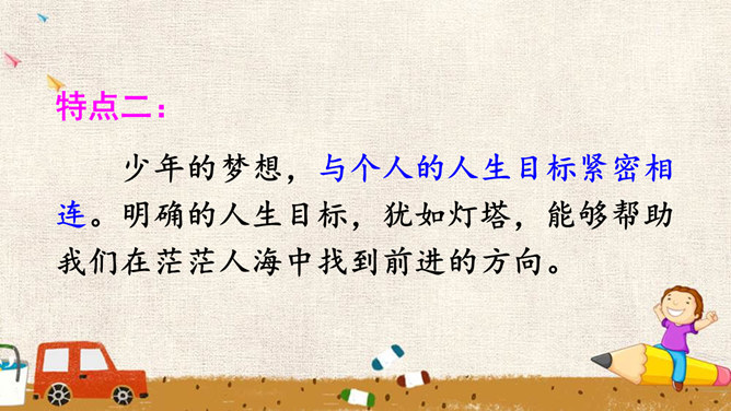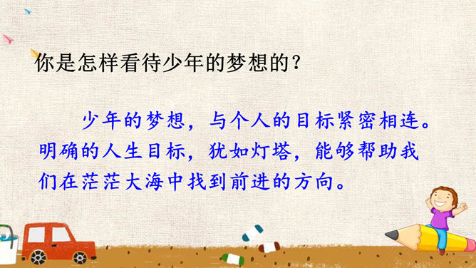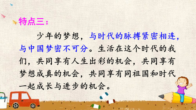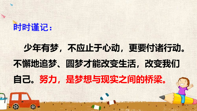 少年的梦想,是人类天真无邪、美丽可爱的愿望。它虽然总是和现实有一定距离,有时甚至不切实际,但人类需要这样的梦想,因为有了这样的梦想,才能不断地进步和发展。少年的梦想,与个人的人生目标紧密相连。明确的人生目标,犹如灯塔,能够帮助我们在茫茫人海中找到前进的方向。少年的梦想,与时代的脉搏紧密相连,与中国梦密不可分。生活在这个时代的我们,共同享有人生出彩的机会,共同享有梦想成真的机会,共同享有同祖国和时代一起成长与进步的机会。所属专题:少年有梦ppt。