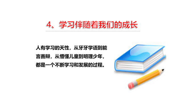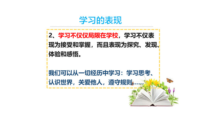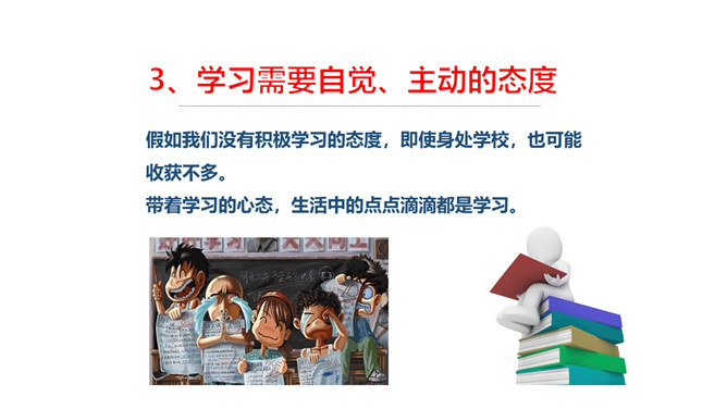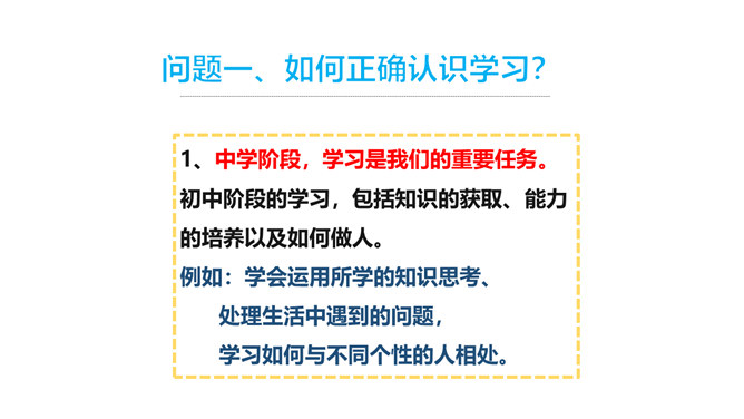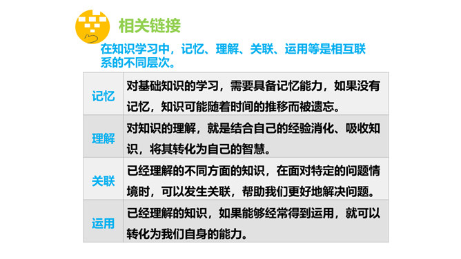 中学阶段,学习是我们的重要任务。初中阶段的学习,包括知识的获取、能力的培养以及如何做人。例如:学会运用所学的知识思考、处理生活中遇到的问题,学习如何与不同个性的人相处。在知识学习中,记忆、理解、关联、运用等是相互联系的不同层次。对基础知识的学习,需要具备记忆能力,如果没有记忆,知识可能随着时间的推移而被遗忘。对知识的理解,就是结合自己的经验消化、吸收知识,将其转化为自己的智慧。已经理解的不同方面的知识,在面对特定的问题情境时,可以发生关联,帮助我们更好地解决问题。所属专题:学习伴成长ppt。