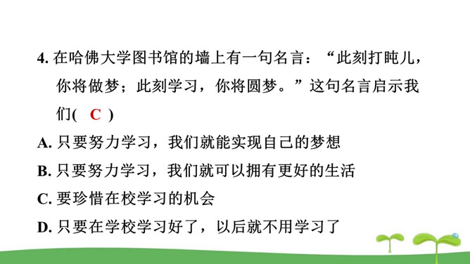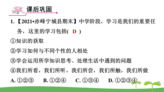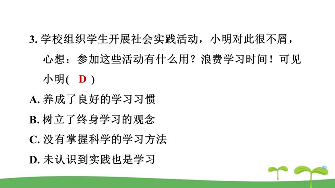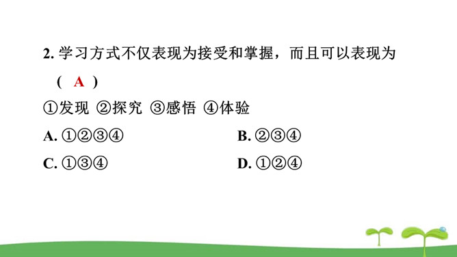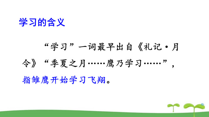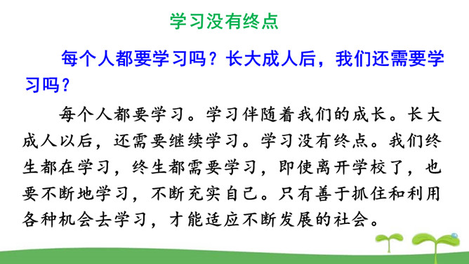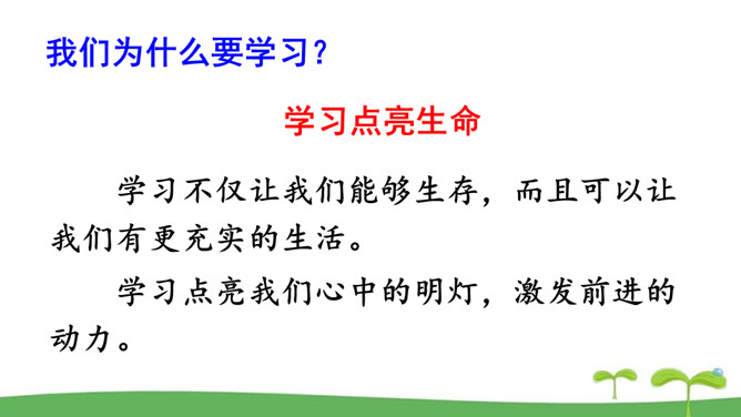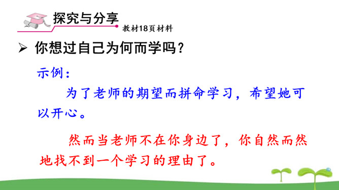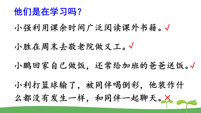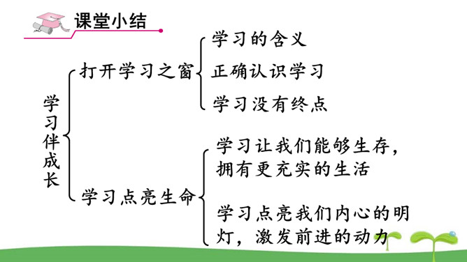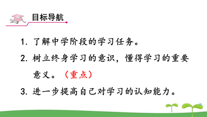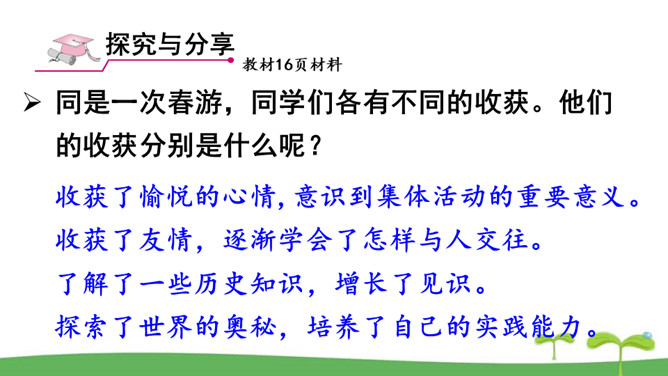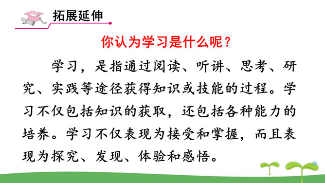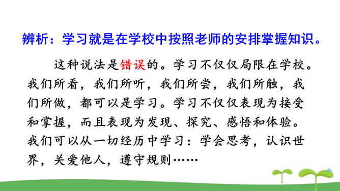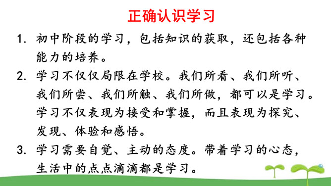 。树立终身学习的意识,懂得学习的重要意义。进一步提高自己对学习的认知能力。同是一次春游,同学们各有不同的收获。他们的收获分别是什么呢?收获了愉悦的心情,意识到集体活动的重要意义。收获了友情,逐渐学会了怎样与人交往。了解了一些历史知识,增长了见识。探索了世界的奥秘,培养了自己的实践能力。初中阶段的学习,包括知识的获取,还包括各种能力的培养。学习不仅仅局限在学校。我们所看、我们所听、我们所尝、我们所触、我们所做,都可以是学习。学习不仅表现为接受和掌握,而且表现为探究、发现、体验和感悟。所属专题:学习伴成长ppt。