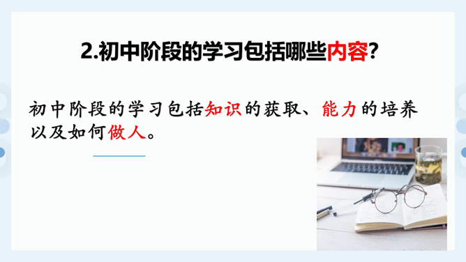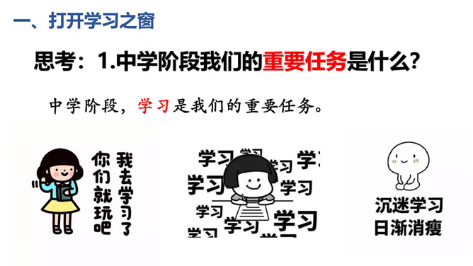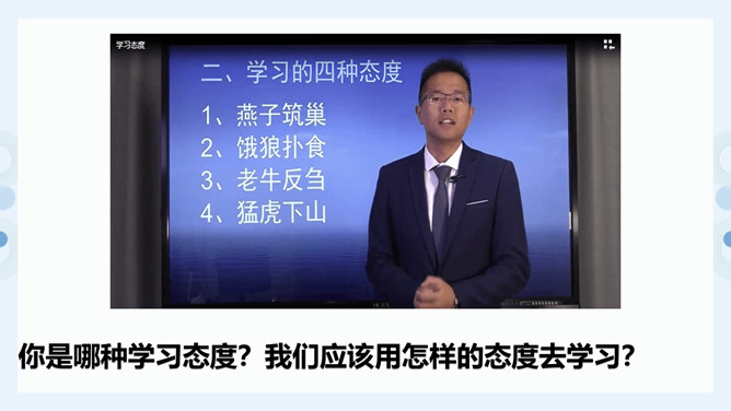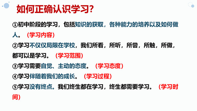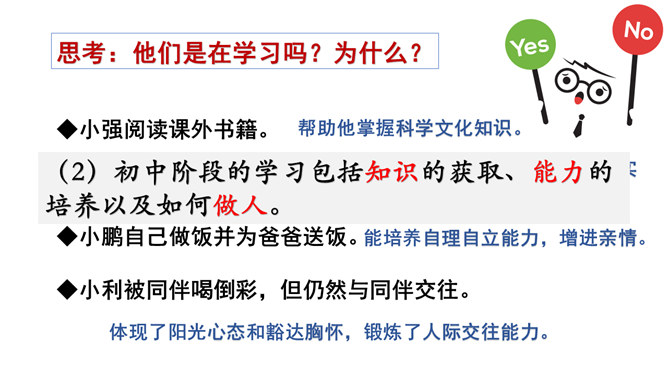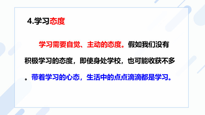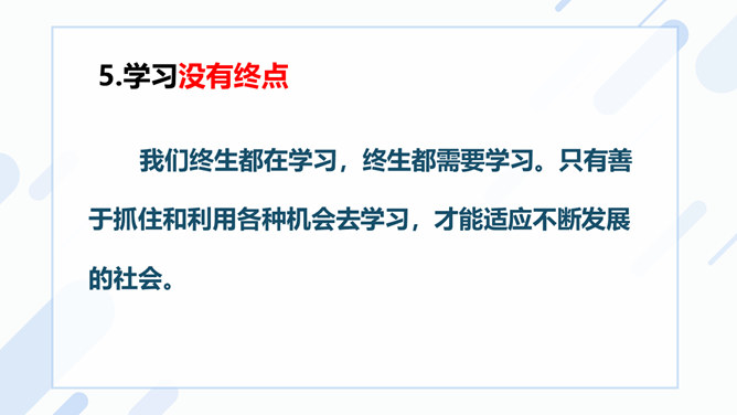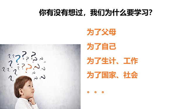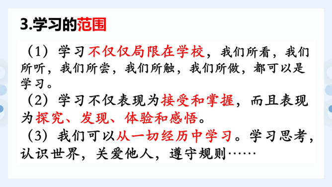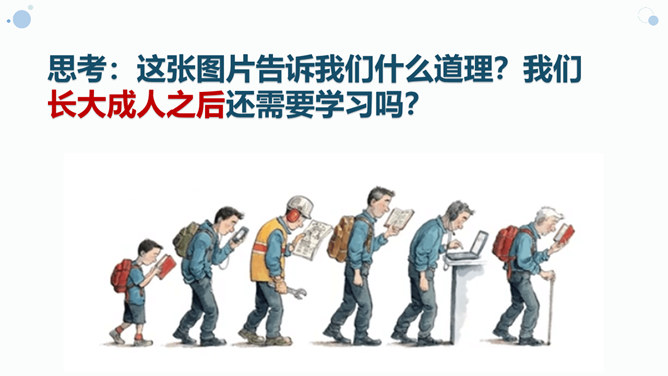 (1)学习不仅仅局限在学校,我们所看,我们所听,我们所尝,我们所触,我们所做,都可以是学习。(2)学习不仅表现为接受和掌握,而且表现为探究、发现、体验和感悟。(3)我们可以从一切经历中学习。学习思考,认识世界,关爱他人,遵守规则……学习需要自觉、主动的态度。假如我们没有积极学习的态度,即使身处学校,也可能收获不多。带着学习的心态,生活中的点点滴滴都是学习。思考:这张图片告诉我们什么道理?我们长大成人之后还需要学习吗?我们终生都在学习,终生都需要学习。所属专题:学习伴成长ppt。