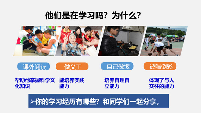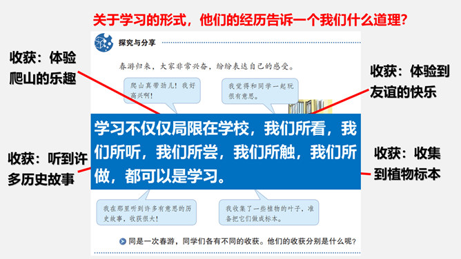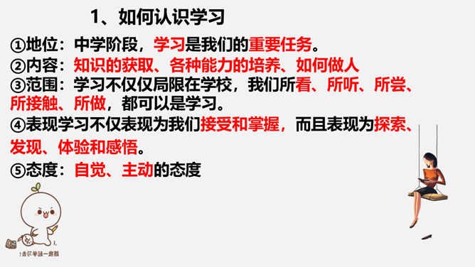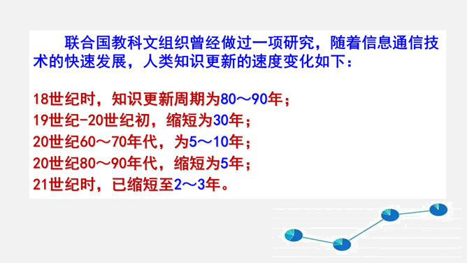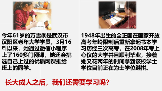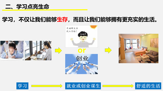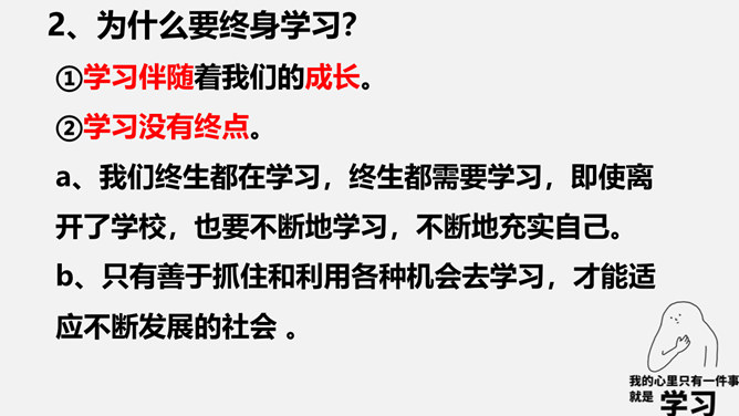 为什么要终身学习?①学习伴随着我们的成长。②学习没有终点。a、我们终生都在学习,终生都需要学习,即使离开了学校,也要不断地学习,不断地充实自己。b、只有善于抓住和利用各种机会去学习,才能适应不断发展的社会 。我们为什么要学习?学习让你收获了什么?学习,不仅让我们能够生存,而且让我们能够拥有更充实的生活。学习,改变了思维方式和行为,提升我们的能力和智慧;学习,让我们面前的世界变得更广阔、更精彩;学习,拓展了新的通道,让我们体验不同的生活方式。所属专题:学习伴成长ppt。