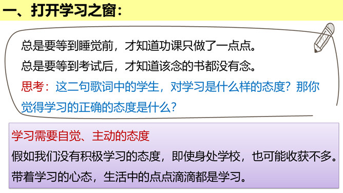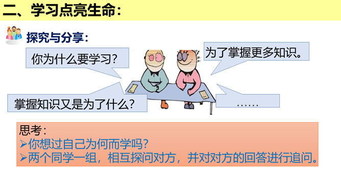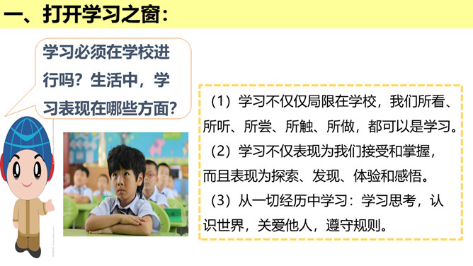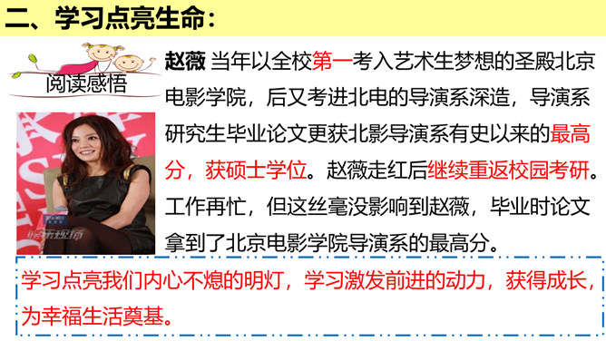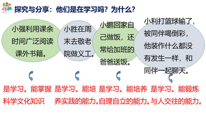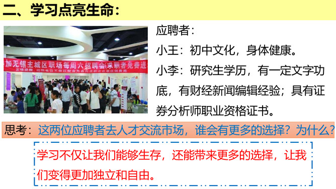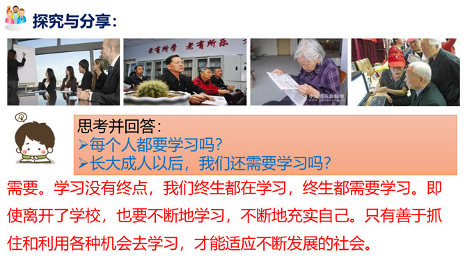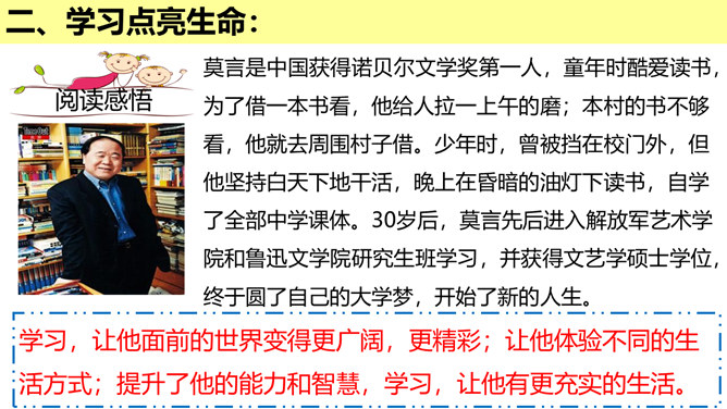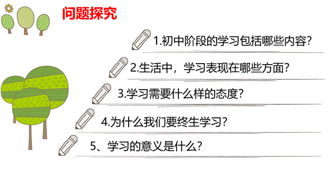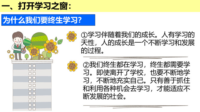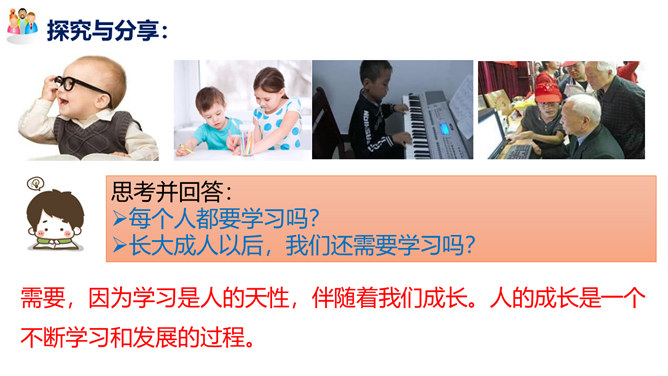 学习的意义是什么?(1)学习,不仅让我们能够生存,而且可以让我们有更充实的生活。①学习,打开了生命的视窗,让我们面前的世界变得更广阔、更精彩;②学习,拓展了新的通道,让我们体验不同的生活方式;③学习改变了思维方式和行为,提升我们的能力和智慧;④学习,带来了更多的选择,让我们变得更加独立和自由;等等。(2)学习点亮我们内心不熄的明灯,激发前进的持续动力。在学习中,我们分享生命经验,获得成长,同时也增益他人,服务社会,为幸福生活奠基。所属专题:学习伴成长ppt。