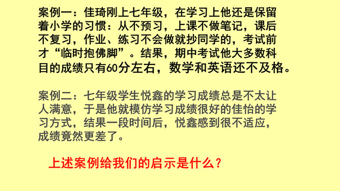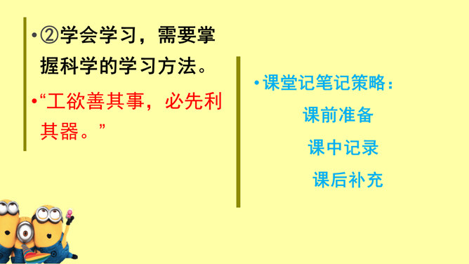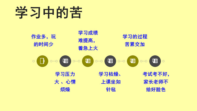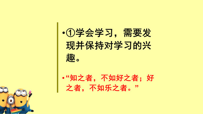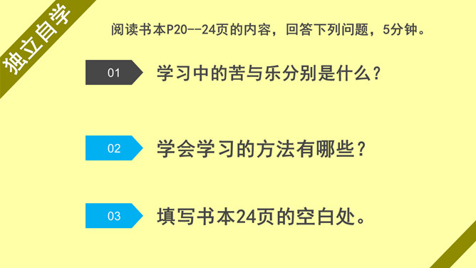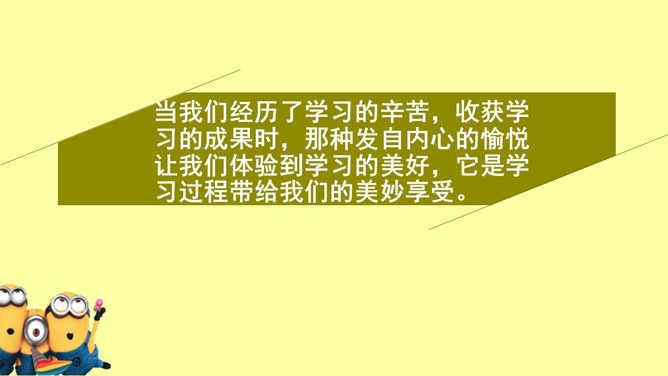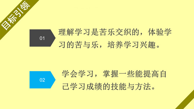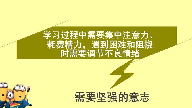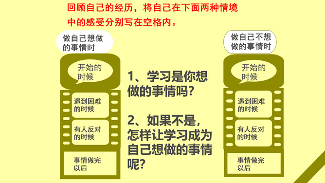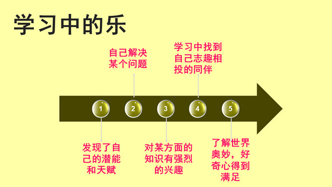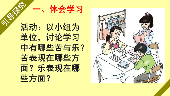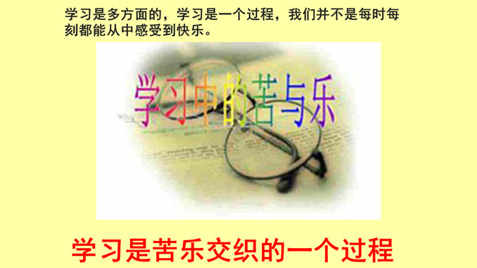 理解学习是苦乐交织的,体验学习的苦与乐,培养学习兴趣。学会学习,掌握一些能提高自己学习成绩的技能与方法。活动:以小组为单位,讨论学习中有哪些苦与乐?苦表现在哪些方面?乐表现在哪些方面?学习过程中需要集中注意力、耗费精力,遇到困难和阻挠时需要调节不良情绪。当我们经历了学习的辛苦,收获学习的成果时,那种发自内心的愉悦让我们体验到学习的美好,它是学习过程带给我们的美妙享受。学习是多方面的,学习是一个过程,我们并不是每时每刻都能从中感受到快乐。所属专题:享受学习ppt。
