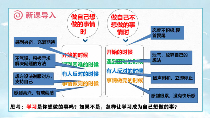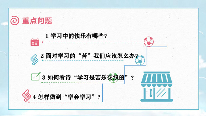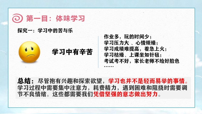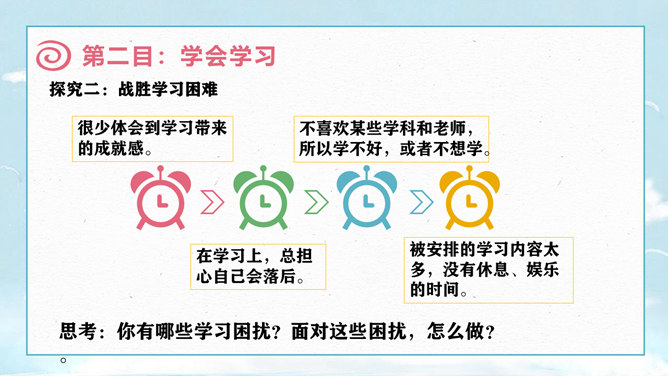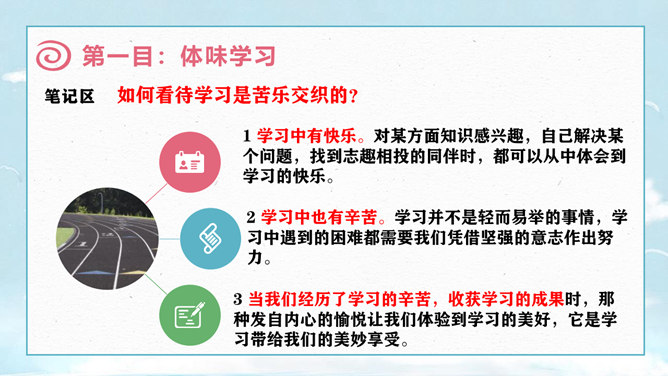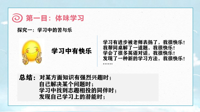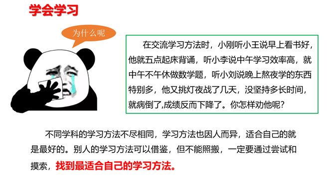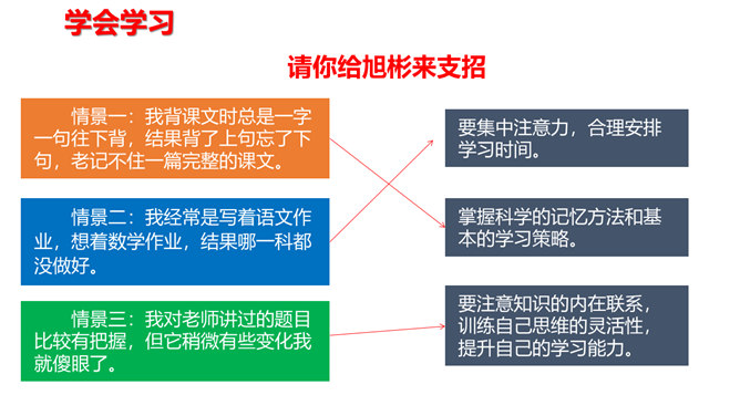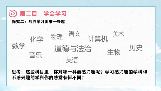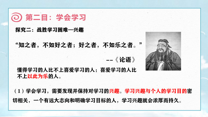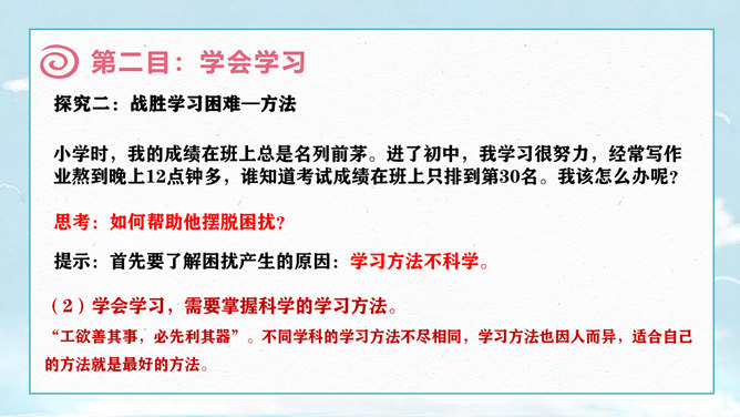 学会学习,需要发现并保持对学习的兴趣。学习兴趣与个人的学习目的密切相关,一个有远大志向和明确学习目标的人,学习兴趣就会浓厚而持久。学会学习,需要掌握科学的学习方法。“工欲善其事,必先利其器”。不同学科的学习方法不尽相同,学习方法也因人而异,适合自己的方法就是最好的方法。不同学科的学习方法不尽相同,学习方法也因人而异,适合自己的就是最好的。别人的学习方法可以借鉴,但不能照搬,一定要通过尝试和摸索,找到最适合自己的学习方法。所属专题:享受学习ppt。