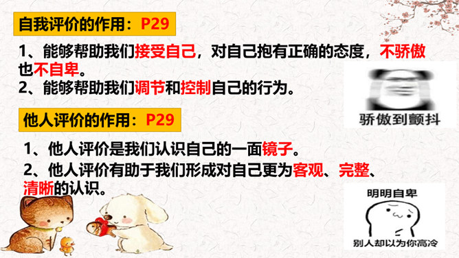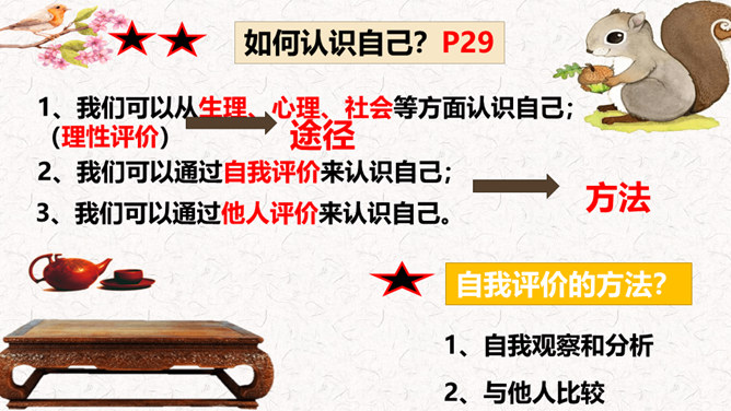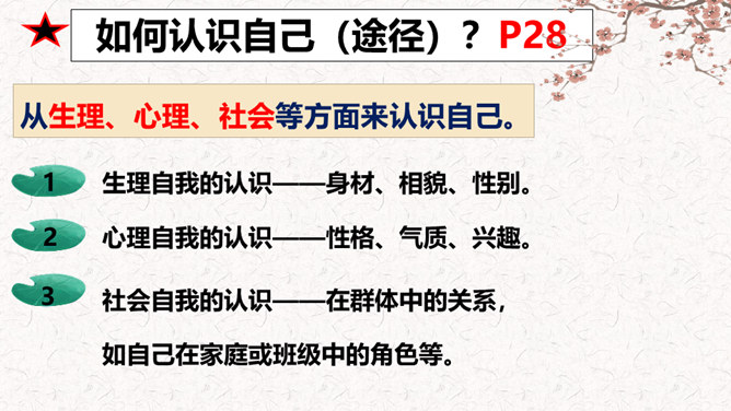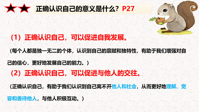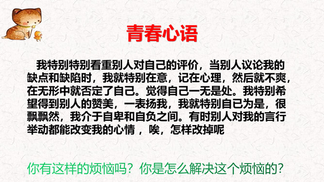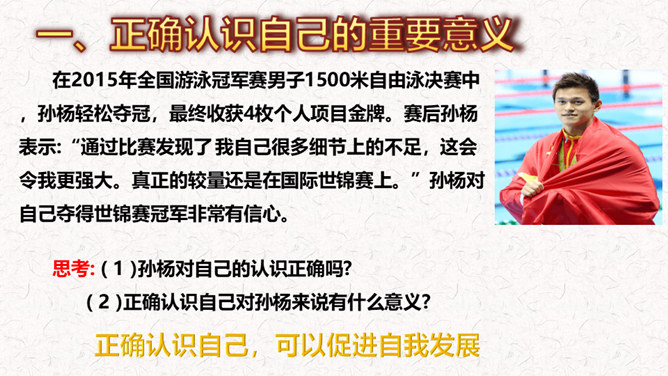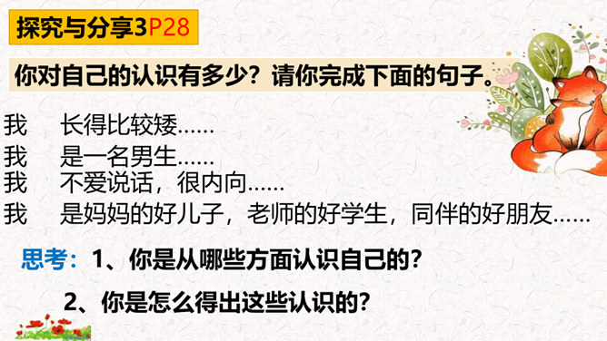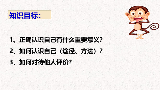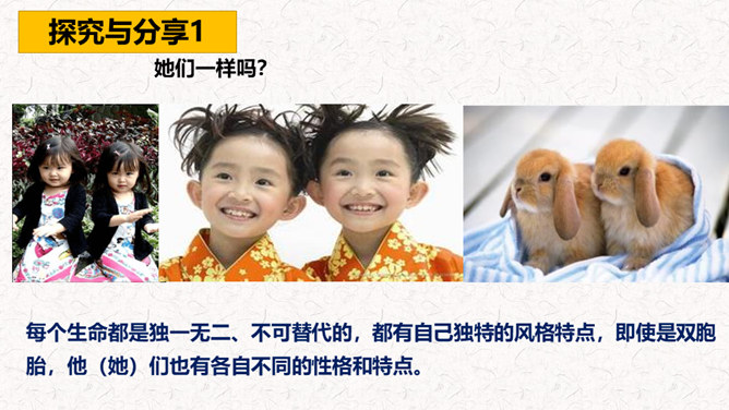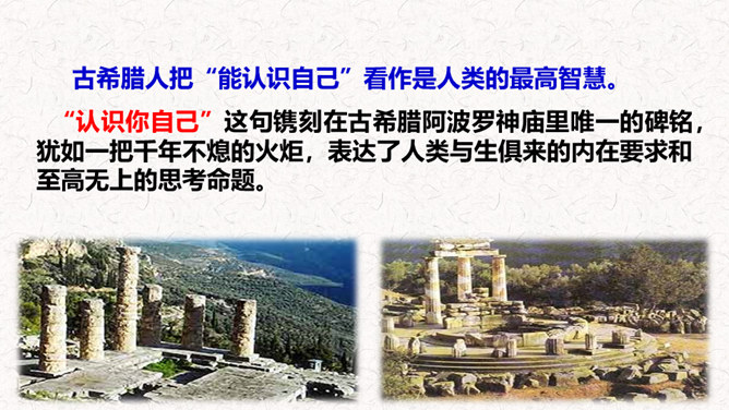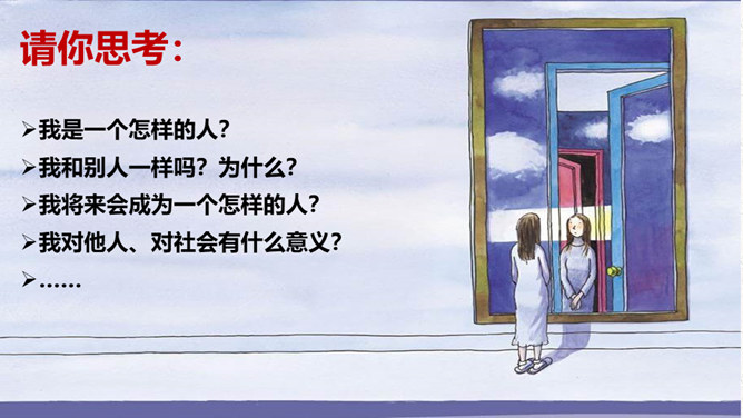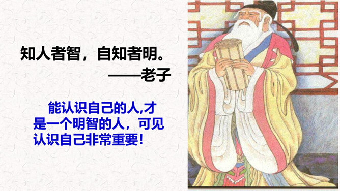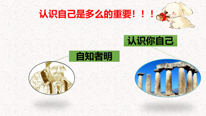 古希腊人把“能认识自己”看作是人类的最高智慧。“认识你自己”这句镌刻在古希腊阿波罗神庙里唯一的碑铭,犹如一把千年不熄的火炬,表达了人类与生俱来的内在要求和至高无上的思考命题。 请你思考:我是一个怎样的人?我和别人一样吗?为什么?我将来会成为一个怎样的人?我对他人、对社会有什么意义?每个生命都是独一无二、不可替代的,都有自己独特的风格特点,即使是双胞胎,他(她)们也有各自不同的性格和特点。正确认识自己,有助于我们认识到自己离不开他人和社会,从而更好地理解、宽容和善待他人,与他人积极互动。所属专题:认识自己ppt。