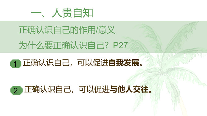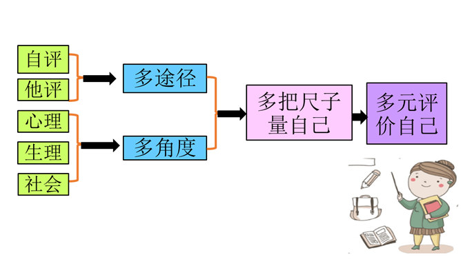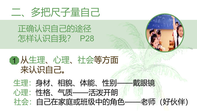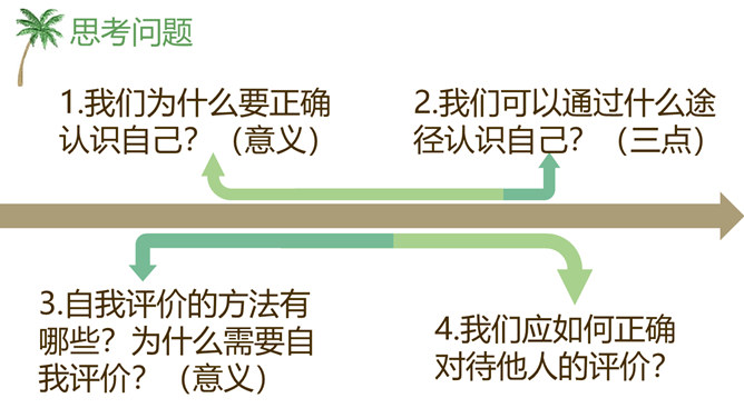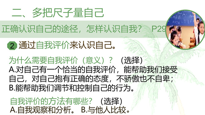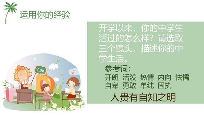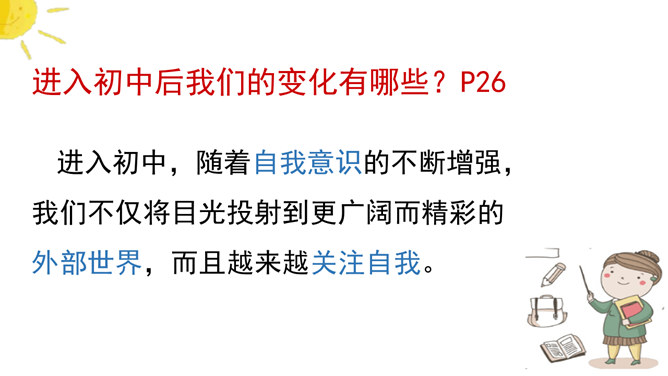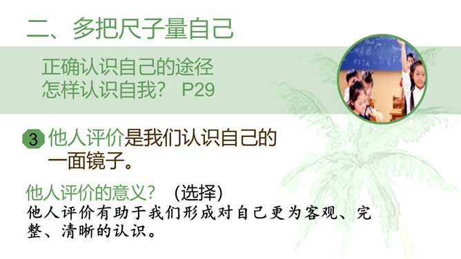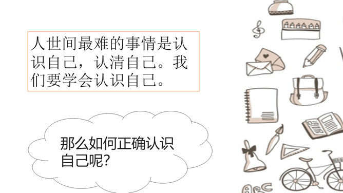 开学以来,你的中学生活过的怎么样?请选取三个镜头,描述你的中学生活。学会自我评价,正确面对他人评价,能够客观地认识自己。懂得认识自己,了解认识自己的途径和方法。树立不断探索自己、发现自己、发展自己的意识。人世间最难的事情是认识自己,认清自己。我们要学会认识自己。进入初中,随着自我意识的不断增强,我们不仅将目光投射到更广阔而精彩的外部世界,而且越来越关注自我。当他评与自评有不一致的地方时,你是如何看待?重视他人的态度与评价,但也要客观冷静分析,既不能盲从,也不能忽视。所属专题:认识自己ppt。