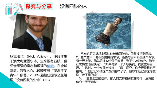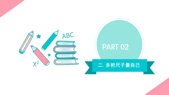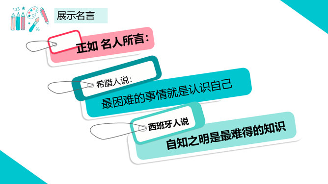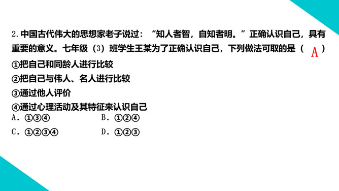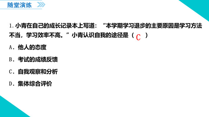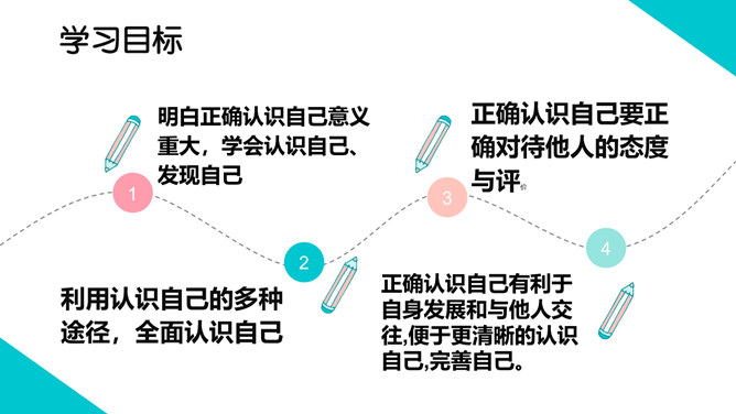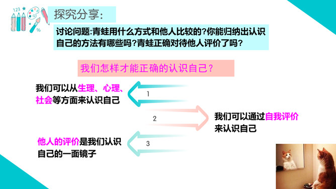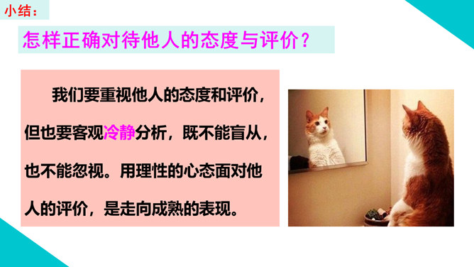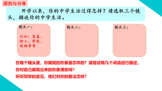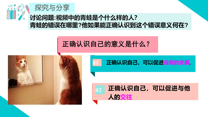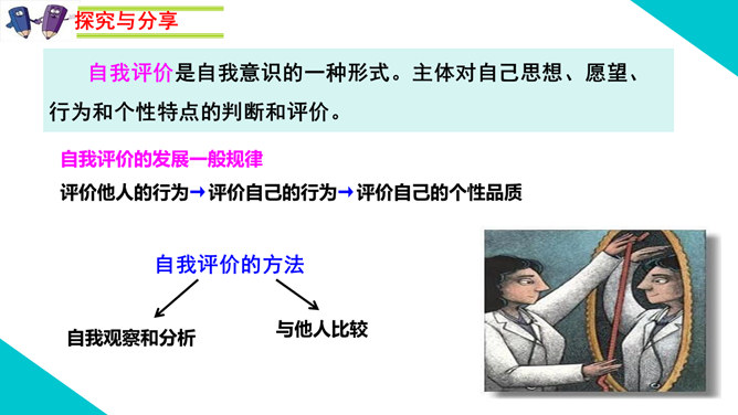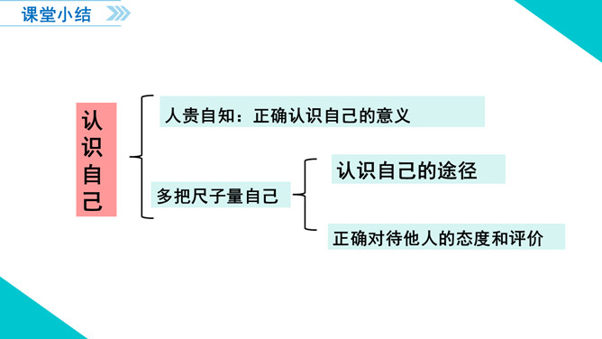 利用认识自己的多种途径,全面认识自己。明白正确认识自己意义重大,学会认识自己、发现自己。正确认识自己有利于自身发展和与他人交往,便于更清晰的认识自己,完善自己。正确认识自己要正确对待他人的态度与评价。开学以来,你的中学生活过得怎样?请选取三个镜头,描述你的中学生活。在每个镜头里,你展现的形象是怎样的?请尝试用几个词语进行描述。你对自己展现出来的形象满意吗?听听同学的意见,他们对你的看法怎样?自我评价是自我意识的一种形式。主体对自己思想、愿望、行为和个性特点的判断和评价。所属专题:认识自己ppt。