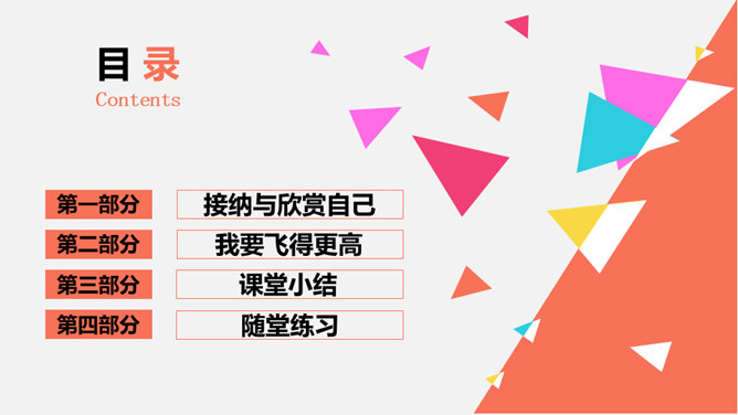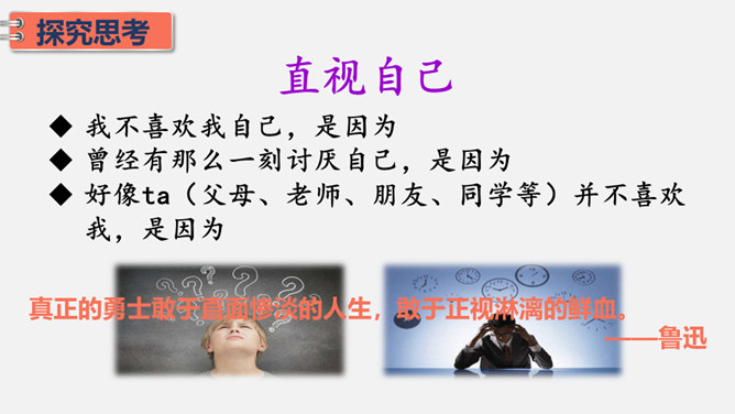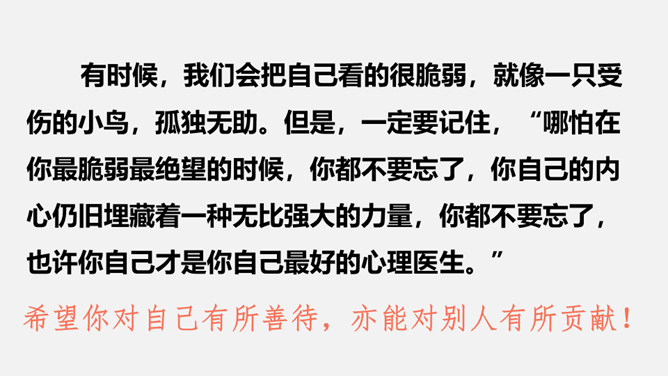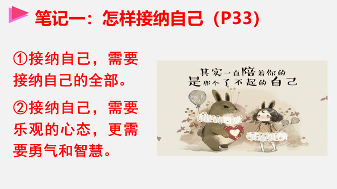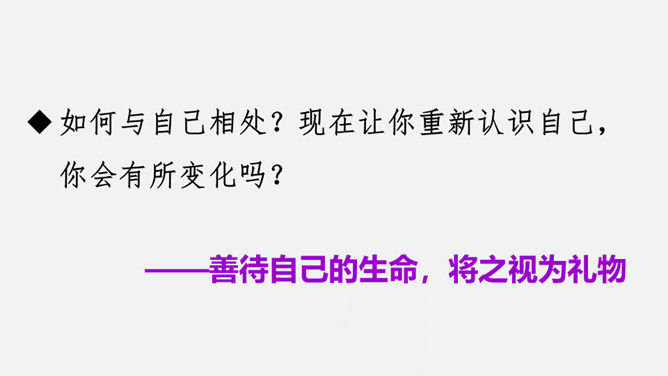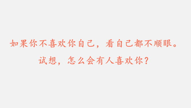 如果你不喜欢你自己,看自己都不顺眼。试想,怎么会有人喜欢你?希望你对自己有所善待,亦能对别人有所贡献!①接纳自己,需要接纳自己的全部。②接纳自己,需要乐观的心态,更需要勇气和智慧。你可以试着:说说自己努力的经历。说说自己的特别之处。自己为家庭、班级、社会所做的奉献。(1)欣赏自己的内容:欣赏自己的独特,欣赏自己的优点,欣赏自己的努力,欣赏自己为他人的奉献。(2)欣赏自己的要求:欣赏自己,不是骄傲自大,也不是目中无人。欣赏自己的同时,善于向他人学习、与他人合作,才能成为一个内涵更加丰富的我。所属专题:做更好的自己ppt。