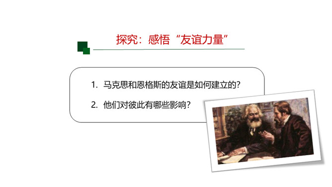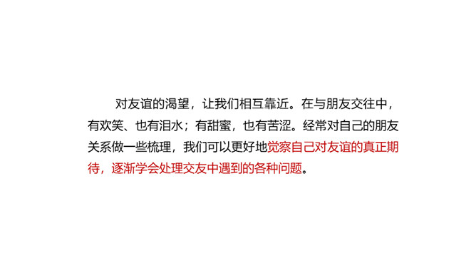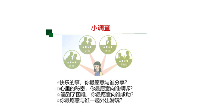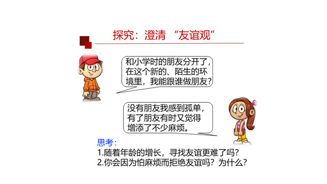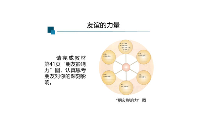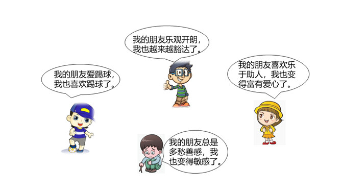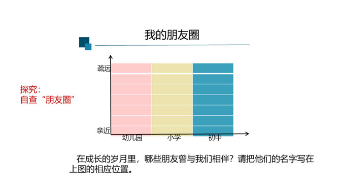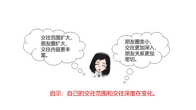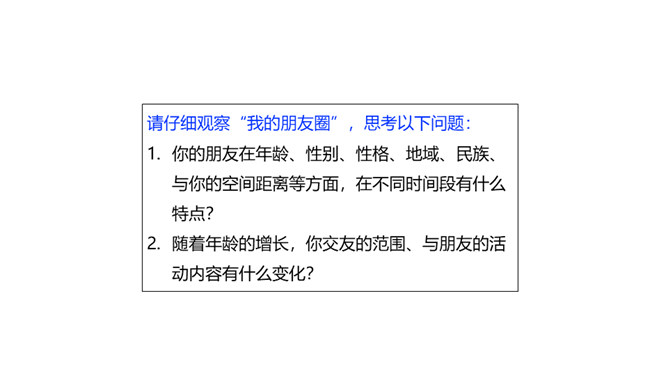 快乐的事,你最愿意与谁分享?心里的秘密,你最愿意向谁倾诉?遇到了困难,你最愿意向谁求助?你最愿意与谁一起外出游玩?在成长的岁月里,哪些朋友曾与我们相伴?请把他们的名字写在上图的相应位置。请仔细观察“我的朋友圈”,思考以下问题:你的朋友在年龄、性别、性格、地域、民族、与你的空间距离等方面,在不同时间段有什么特点?随着年龄的增长,你交友的范围、与朋友的活动内容有什么变化?启示:自己的交往范围和交往深度在变化。交往范围扩大,朋友圈扩大,交往内容更丰富。所属专题:和朋友在一起ppt。
