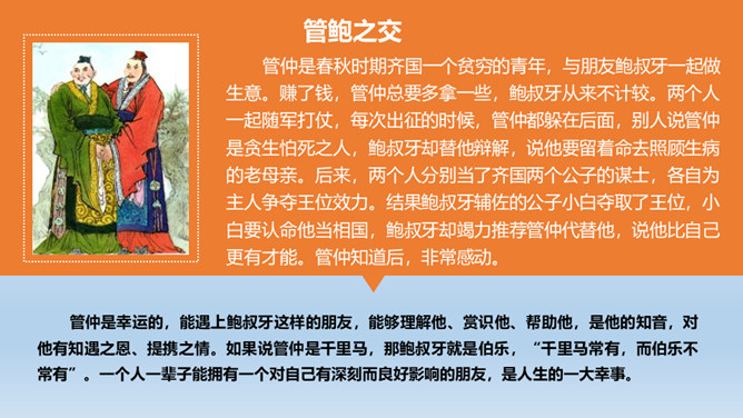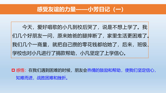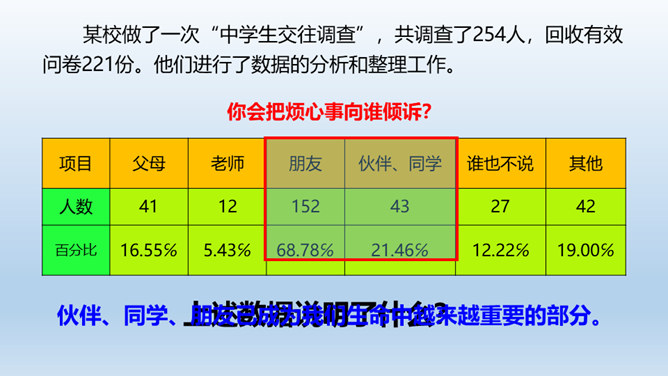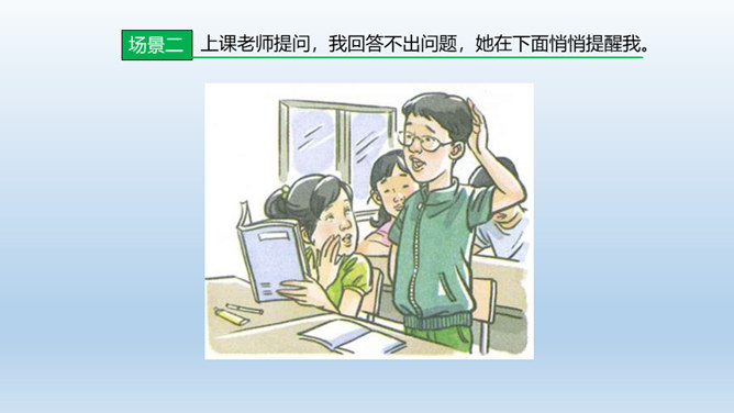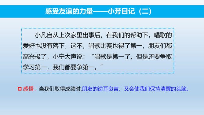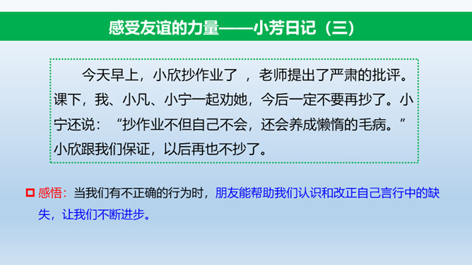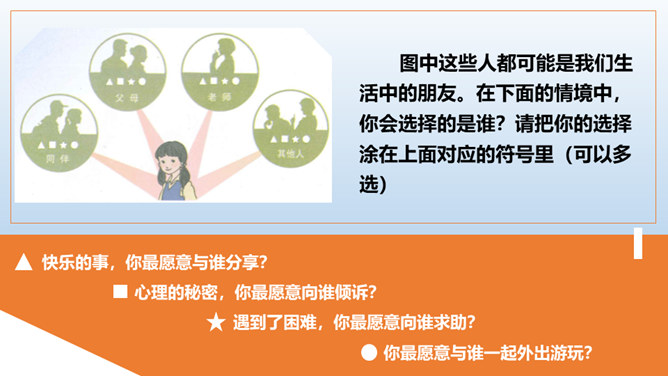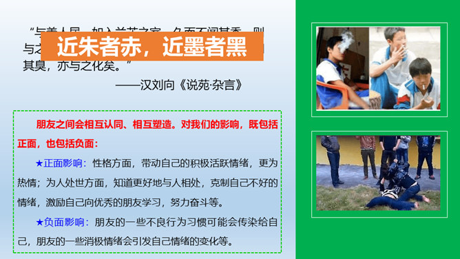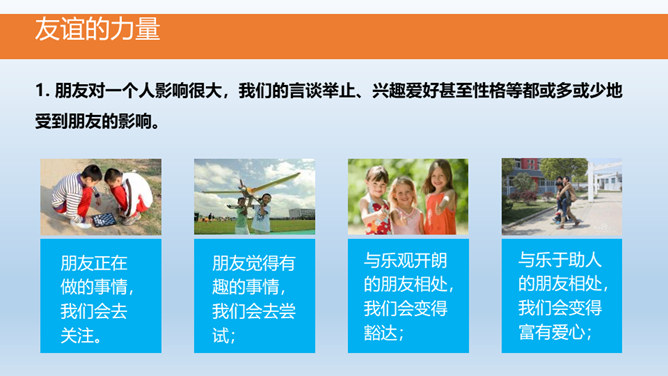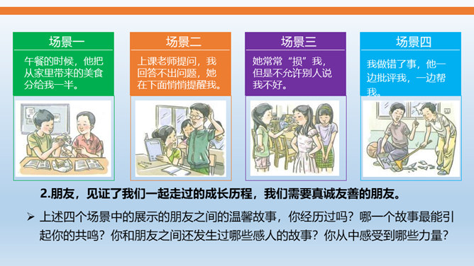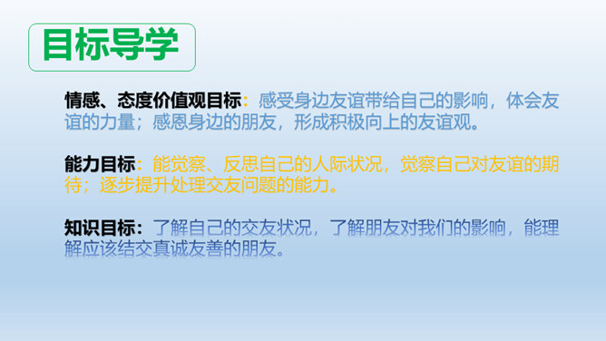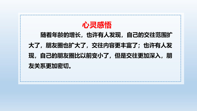 情感、态度价值观目标:感受身边友谊带给自己的影响,体会友谊的力量;感恩身边的朋友,形成积极向上的友谊观。能力目标:能觉察、反思自己的人际状况,觉察自己对友谊的期待;逐步提升处理交友问题的能力。知识目标:了解自己的交友状况,了解朋友对我们的影响,能理解应该结交真诚友善的朋友。随着年龄的增长,也许有人发现,自己的交往范围扩大了,朋友圈也扩大了,交往内容更丰富了;也许有人发现,自己的朋友圈比以前变小了,但是交往更加深入,朋友关系更加密切。请你分享一个你与朋友之间的故事,并谈谈对你的影响。所属专题:和朋友在一起ppt。