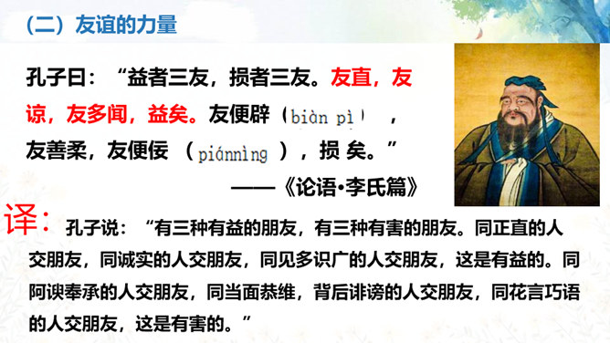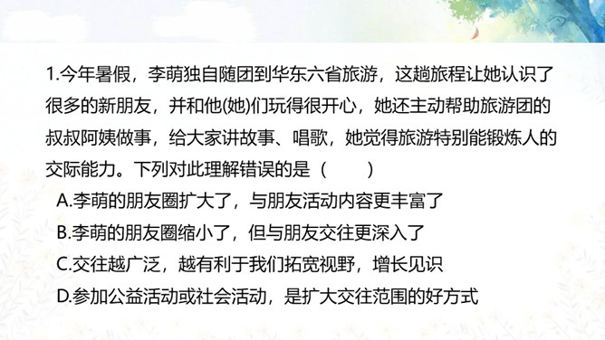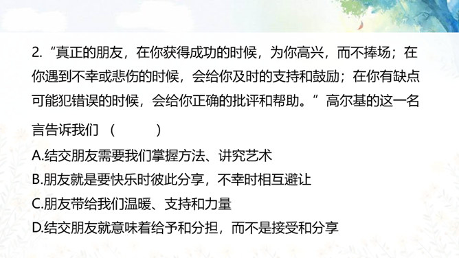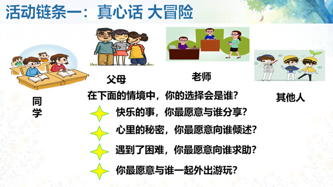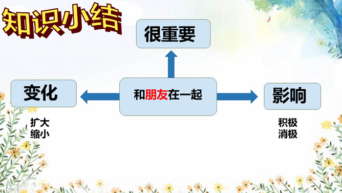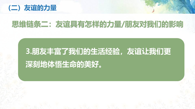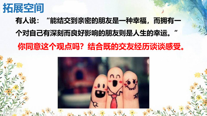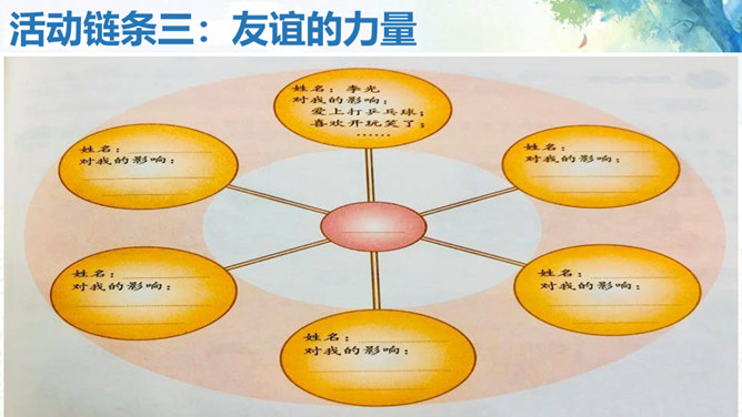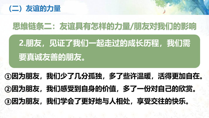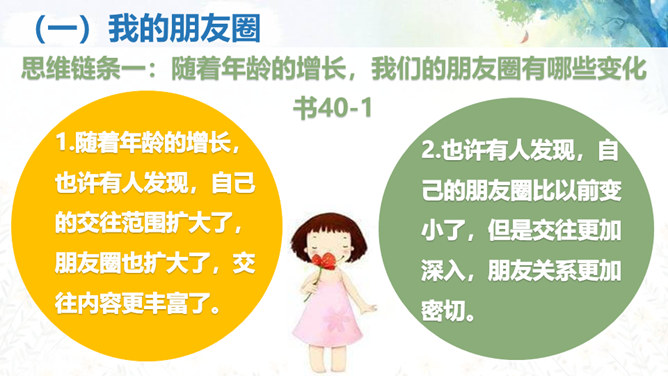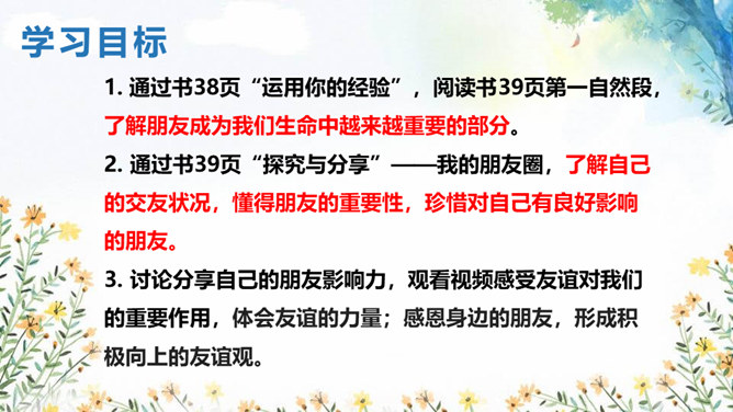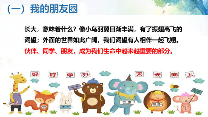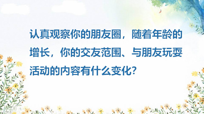 1. 通过书38页“运用你的经验”,阅读书39页第一自然段,了解朋友成为我们生命中越来越重要的部分。2. 通过书39页“探究与分享”——我的朋友圈,了解自己的交友状况,懂得朋友的重要性,珍惜对自己有良好影响的朋友。3. 讨论分享自己的朋友影响力,观看视频感受友谊对我们的重要作用,体会友谊的力量;感恩身边的朋友,形成积极向上的友谊观。长大,意味着什么?像小鸟羽翼日渐丰满,有了振翅高飞的渴望;外面的世界如此广阔,我们渴望有人相伴一起飞翔。伙伴、同学、朋友,成为我们生命中越来越重要的部分。所属专题:和朋友在一起ppt。
