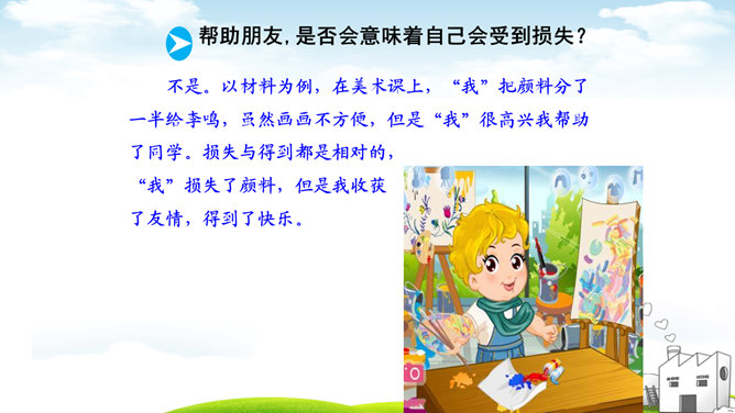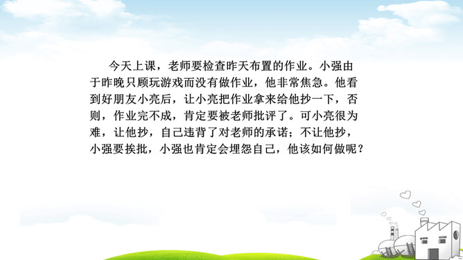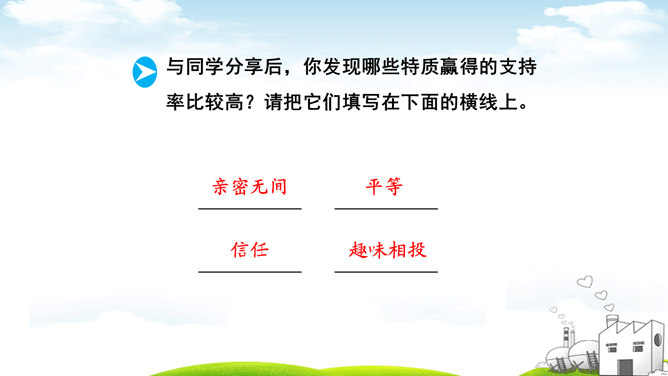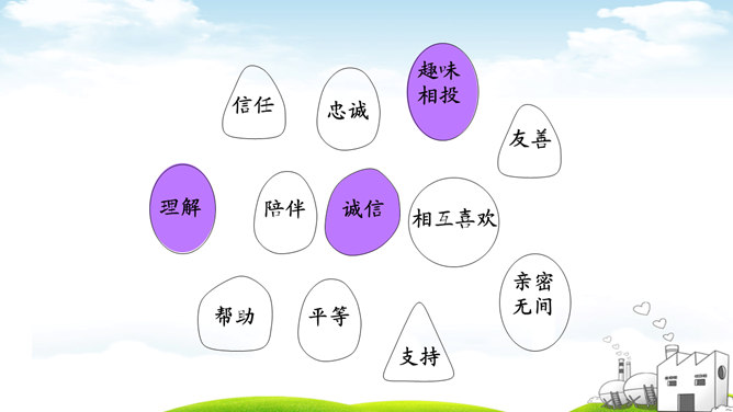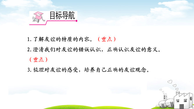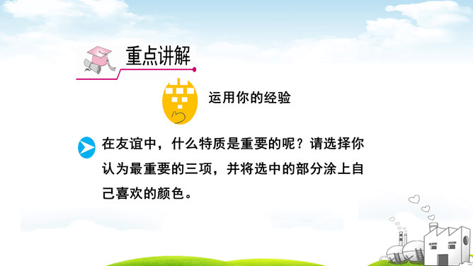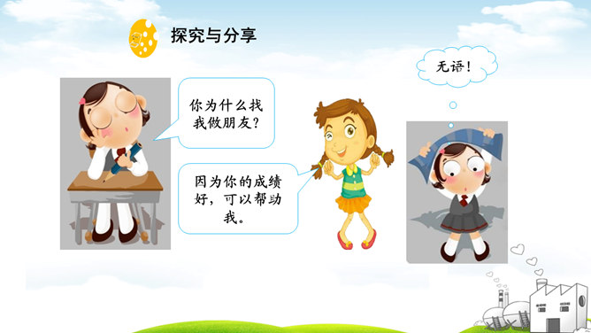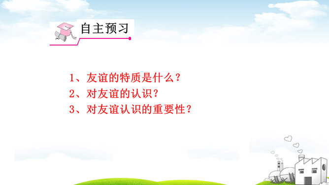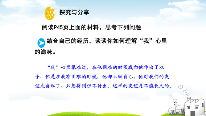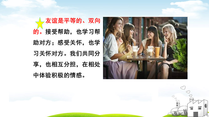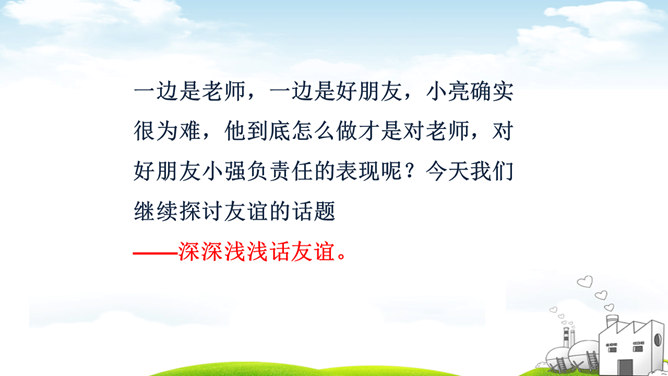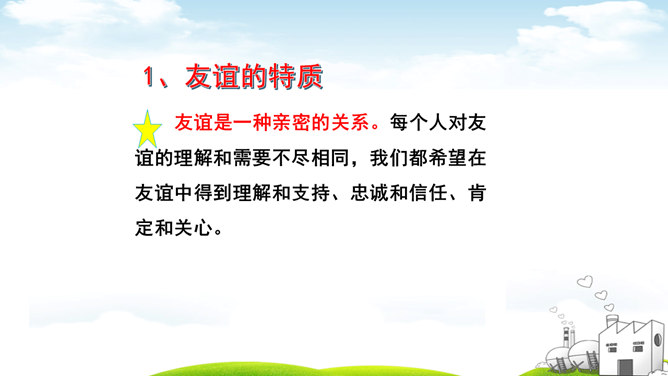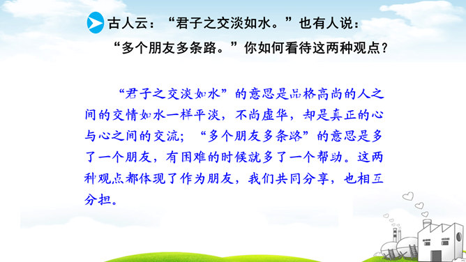 古人云:“君子之交淡如水。”也有人说:“多个朋友多条路。”你如何看待这两种观点?“君子之交淡如水”的意思是品格高尚的人之间的交情如水一样平淡,不尚虚华,却是真正的心与心之间的交流;“多个朋友多条路”的意思是多了一个朋友,有困难的时候就多了一个帮助。这两种观点都体现了作为朋友,我们共同分享,也相互分担。分享和分担是对等的吗?不对。友谊是双向的。友谊是接受,也是付出;是分享也是分担。友谊是平等的,但不一定是对等的。友谊是一种心灵的相遇。友谊的美好就在于它可以超越物质条件、家庭背景、学习成绩等。所属专题:深深浅浅话友谊ppt。