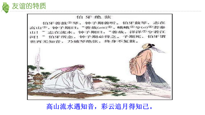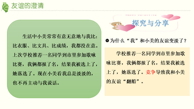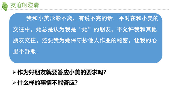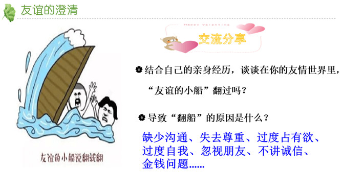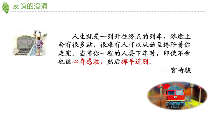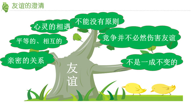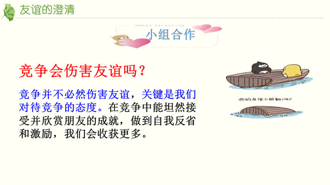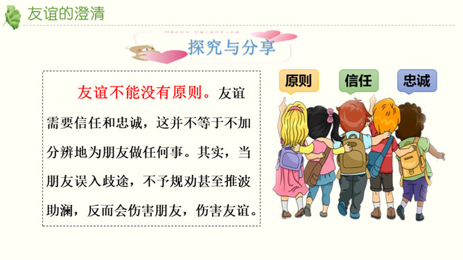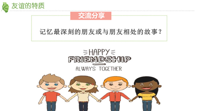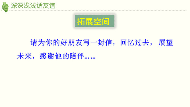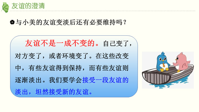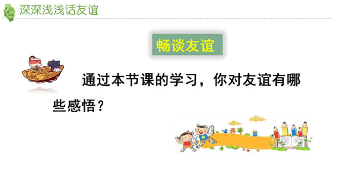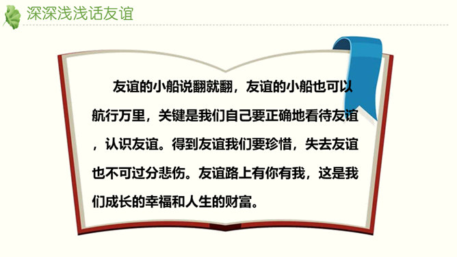 友谊不是一成不变的。自己变了,对方变了,或者环境变了。在这些改变中,有些友谊得到保持,而有些友谊则逐渐淡出。我们要学会接受一段友谊的淡出,坦然接受新的友谊。通过本节课的学习,你对友谊有哪些感悟?友谊的小船说翻就翻,友谊的小船也可以航行万里,关键是我们自己要正确地看待友谊,认识友谊。得到友谊我们要珍惜,失去友谊也不可过分悲伤。友谊路上有你有我,这是我们成长的幸福和人生的财富。请为你的好朋友写一封信,回忆过去, 展望未来,感谢他的陪伴… …所属专题:深深浅浅话友谊ppt。