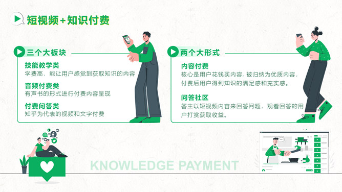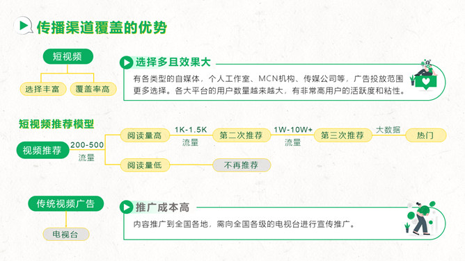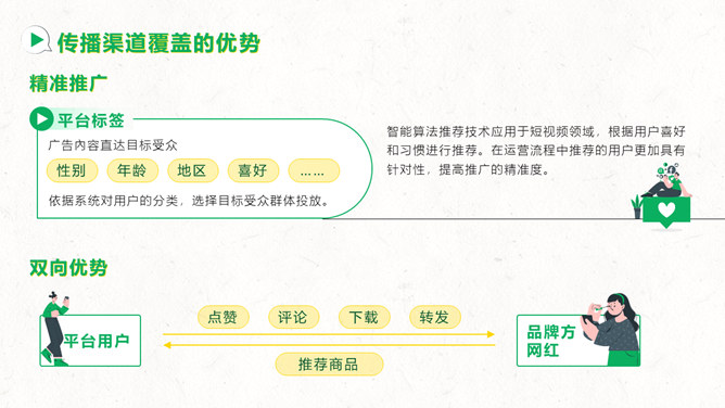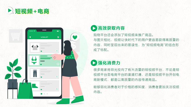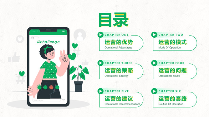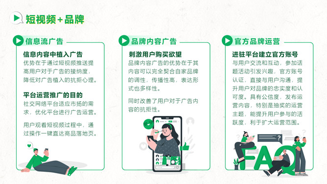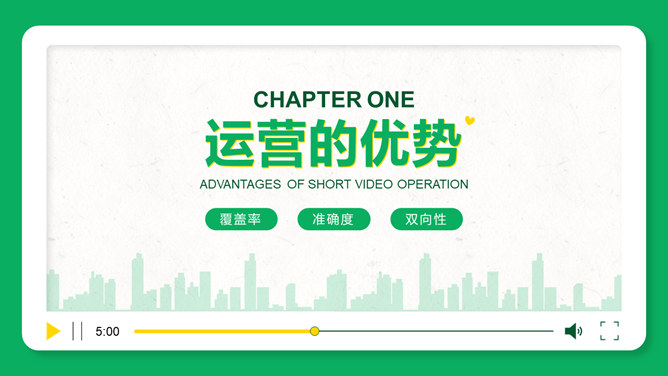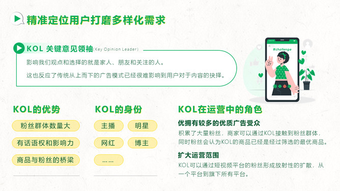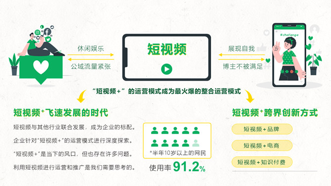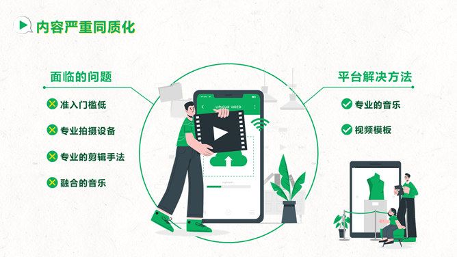 短视频自媒体运营指南PPT模板。一套自媒体短视频用户增长、运营策略宣讲幻灯片模板,扁平化设计风格。