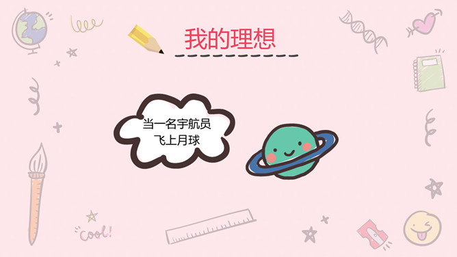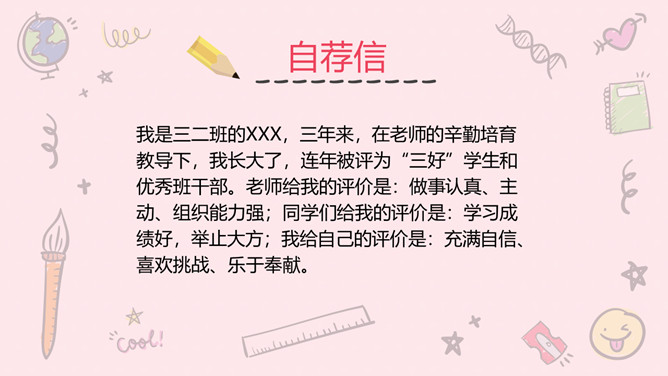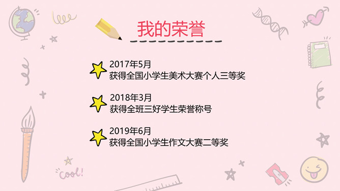小学生班干部竞选PPT模板。一套可爱卡通风格自我介绍幻灯片模板,粉色主色调,适合小学生班干部竞选等用途。