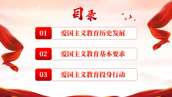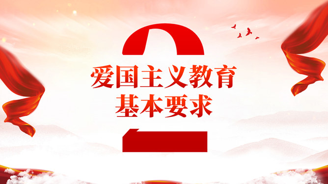 爱国主义精神教育PPT模板。一套爱国主义教育主题模板,包括爱国主义教育历史发展、基本要求、投身行动等。