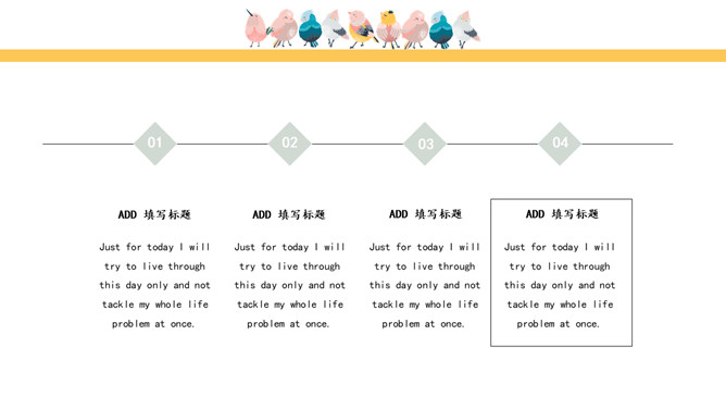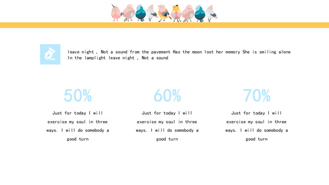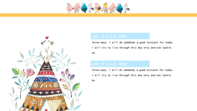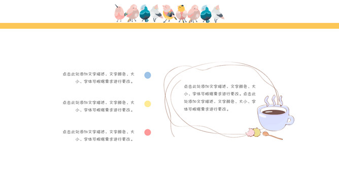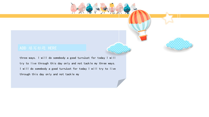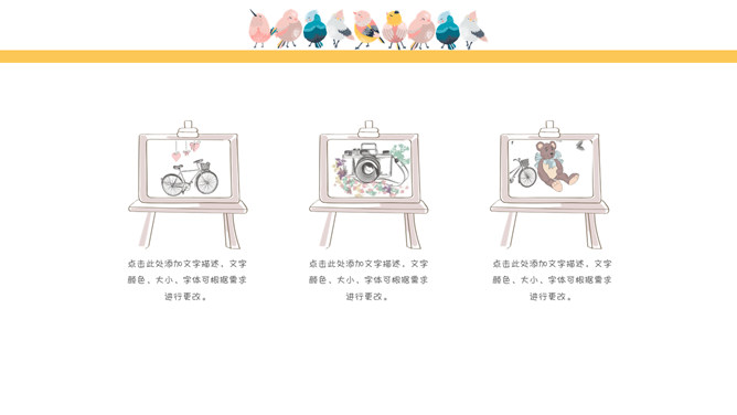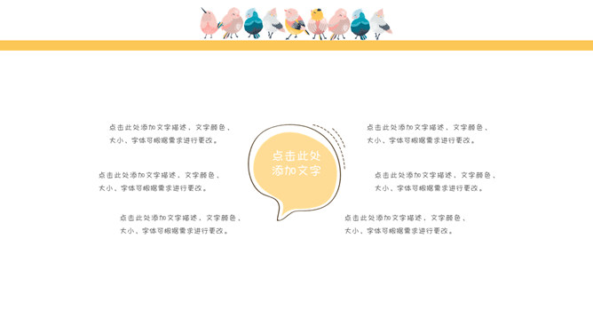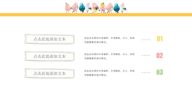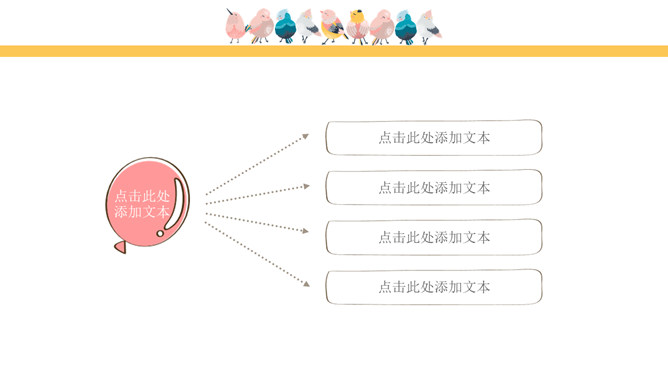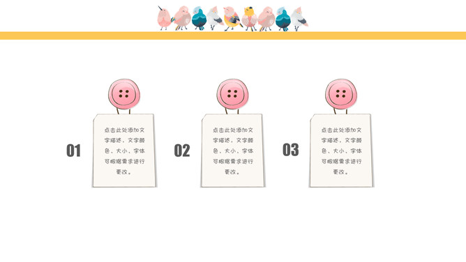 可爱卡通小鸟PPT模板。一套卡通风格设计幻灯片模板,可爱小鸟主题,简约设计,动态播放效果。