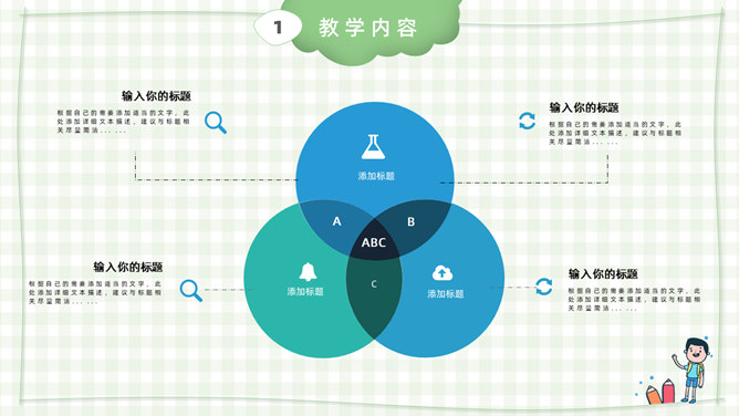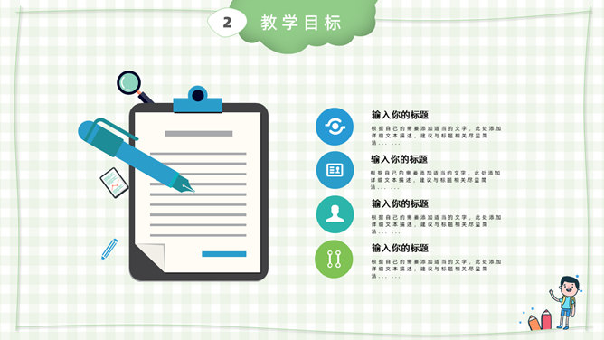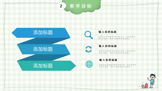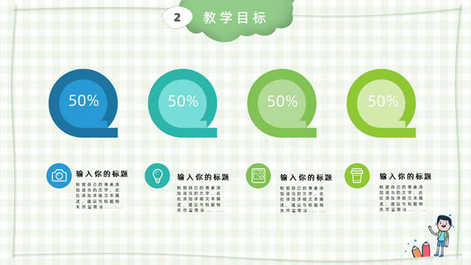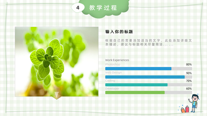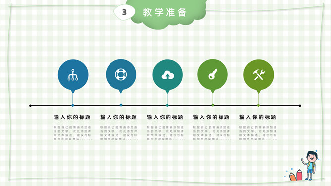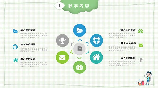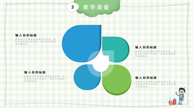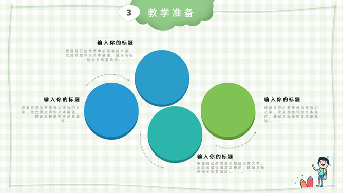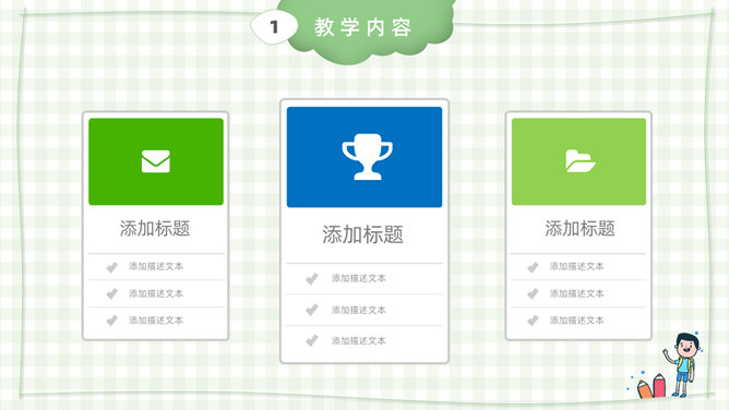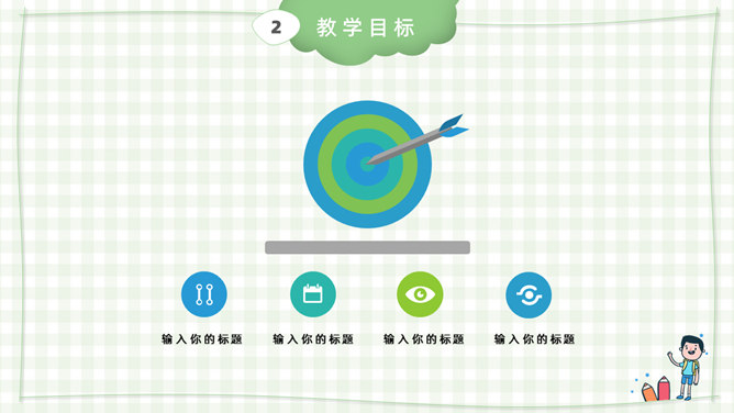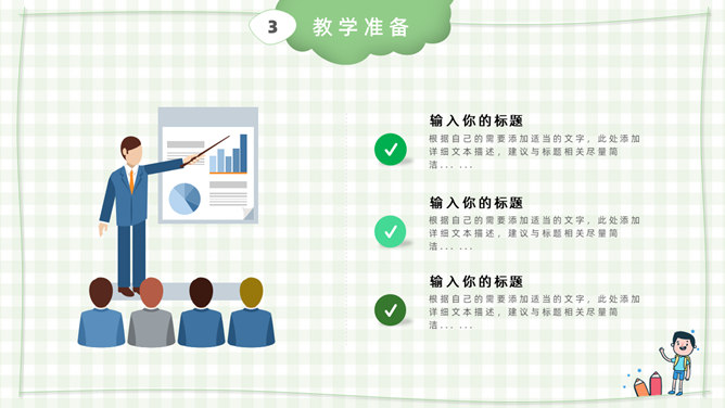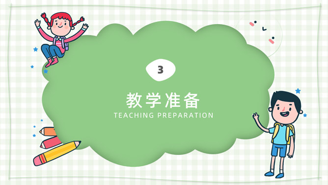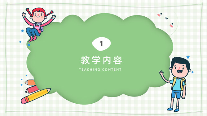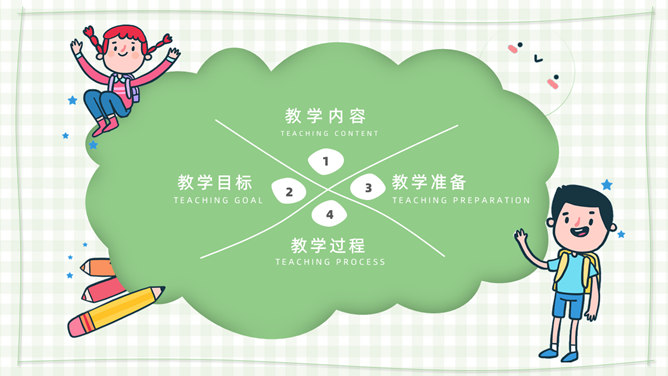 卡通小学教师说课课件PPT模板。一套幼儿园、小学老师说课课件幻灯片模板,绿色格子背景,可爱卡通风格。