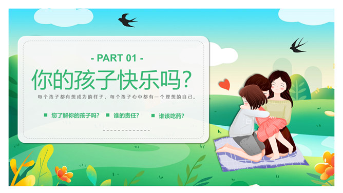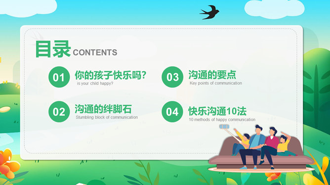 有效亲子沟通技巧PPT模板。目录:你的孩子快乐吗?沟通的要点。沟通的绊脚石。快乐沟通10法。