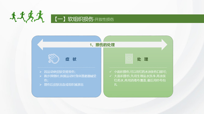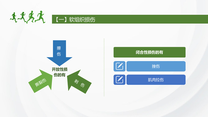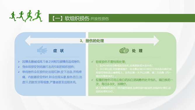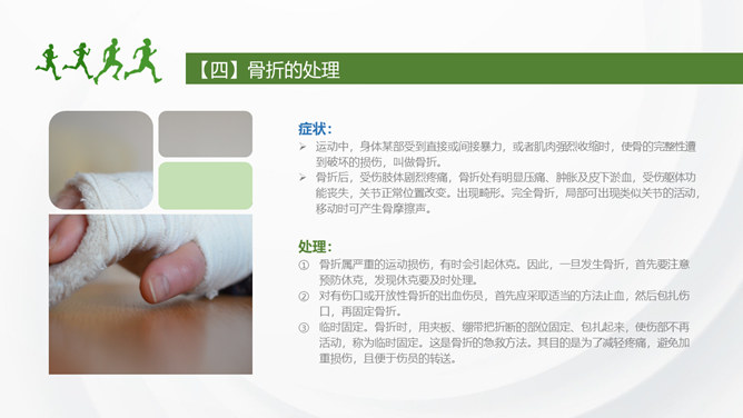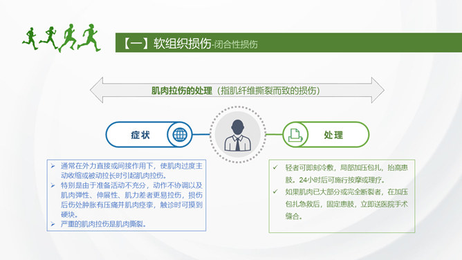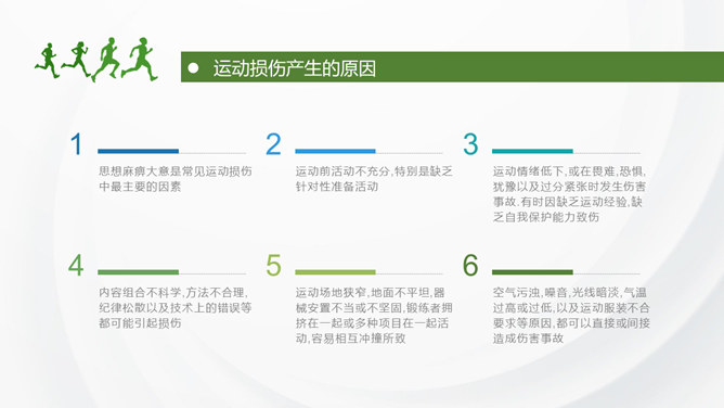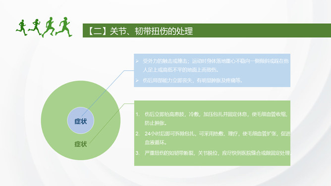 运动损伤的预防与处理PPT模板。运动损伤产生的原因及预防、常见的运动损伤、常见穴位、运动损伤的处理。