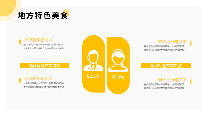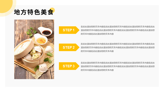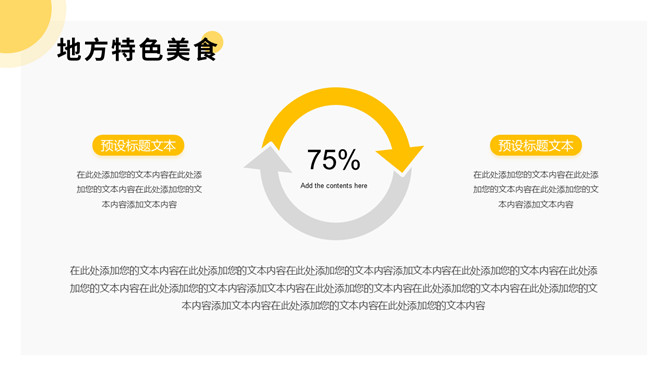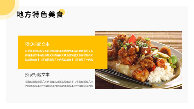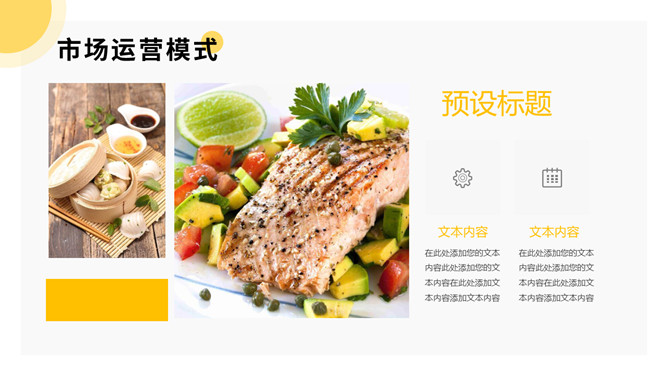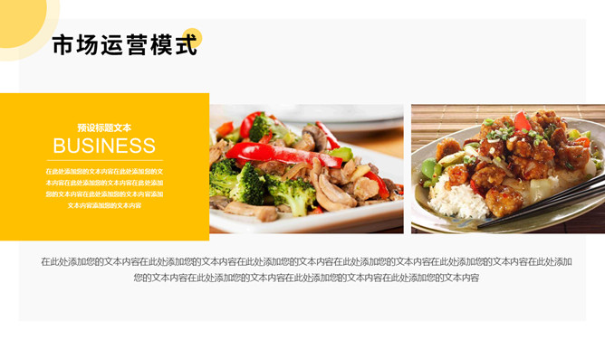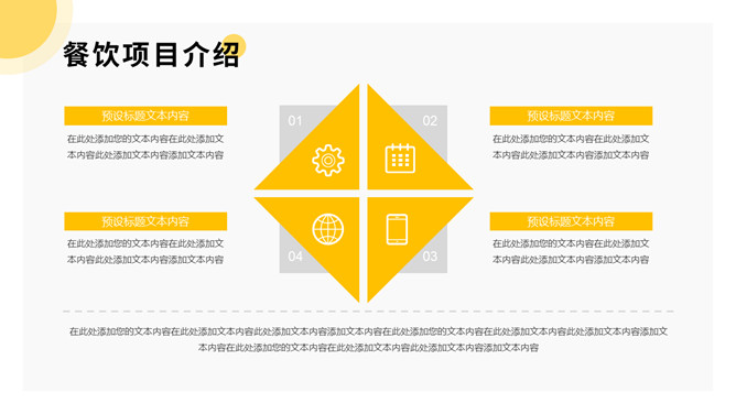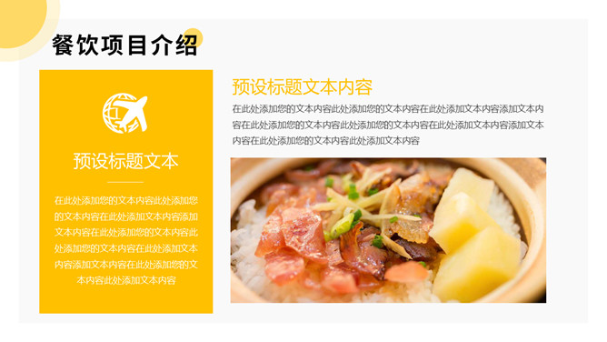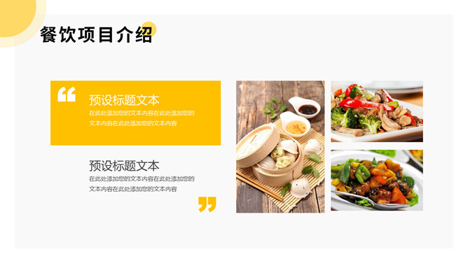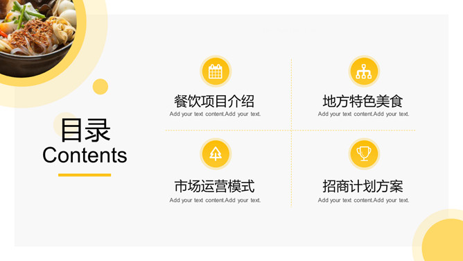 美食餐饮项目招商PPT模板。一套餐饮品牌招商宣传幻灯片模板,黄色主色调,简洁大气,动态播放。