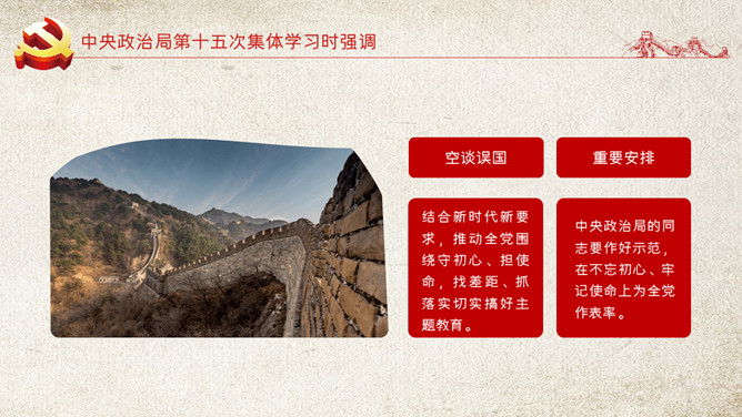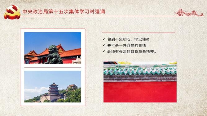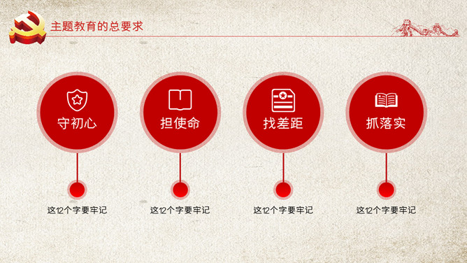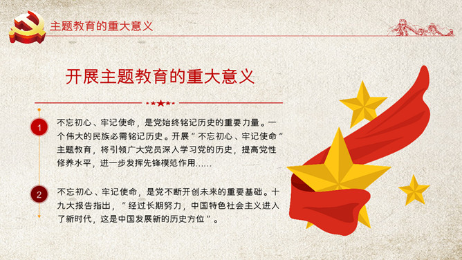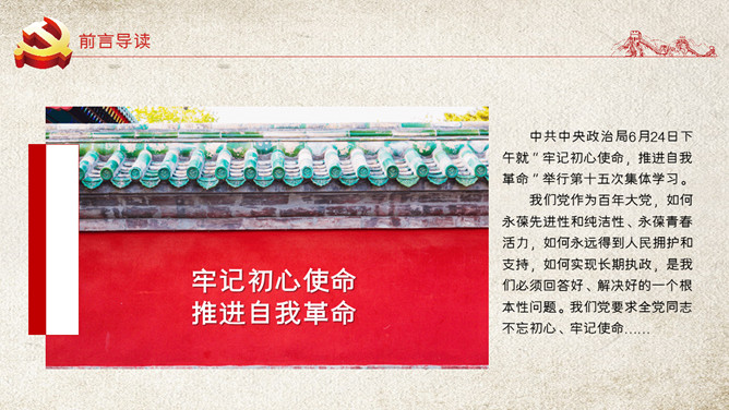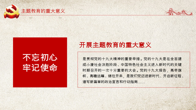 不忘初心牢记初心使命PPT模板。一套牢记初心使命,永葆先进性和纯洁性、永葆青春活力主题教育讲稿课件。