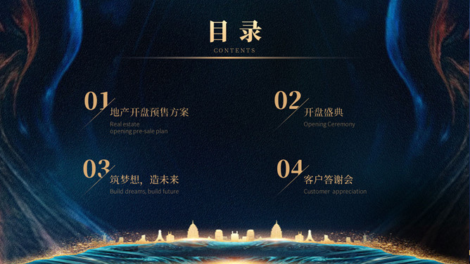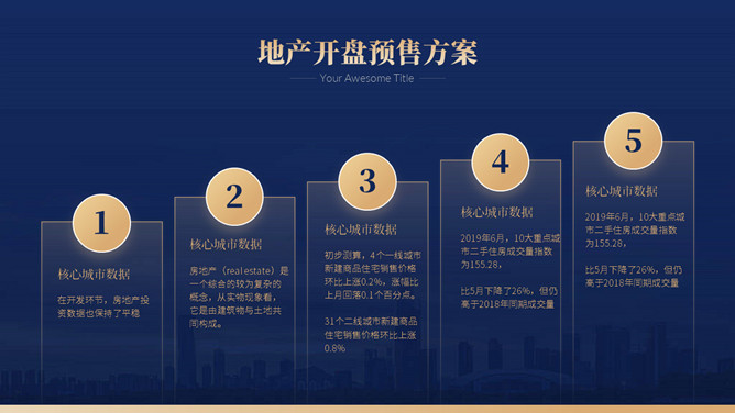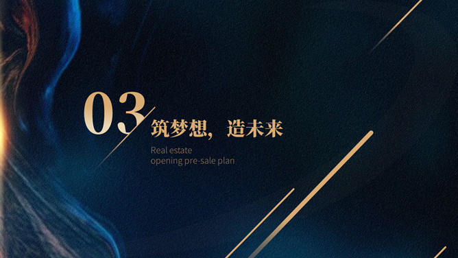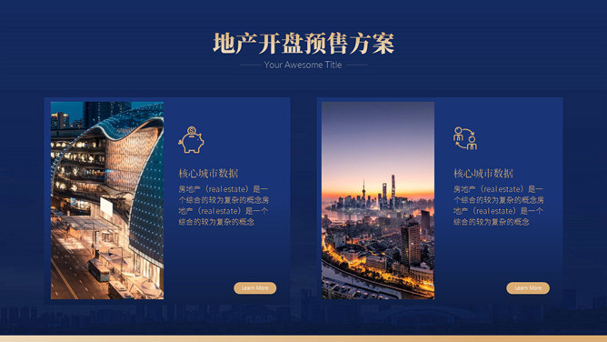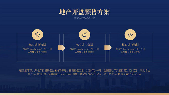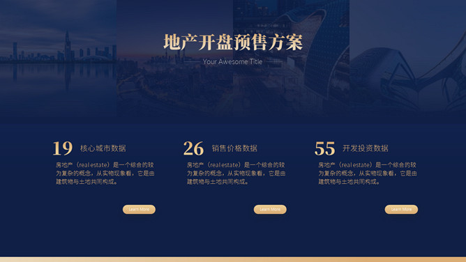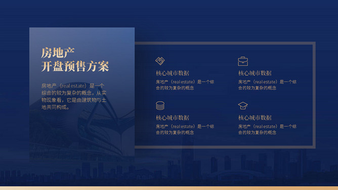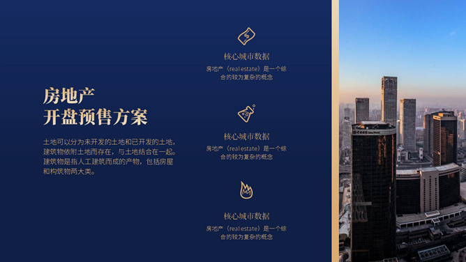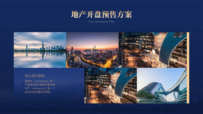 房地产楼盘开盘营销策划方案PPT模板。一套楼盘开盘策划幻灯片模板,高端大气,深蓝主色调,多种图文排版。
