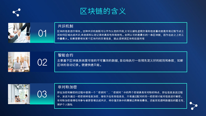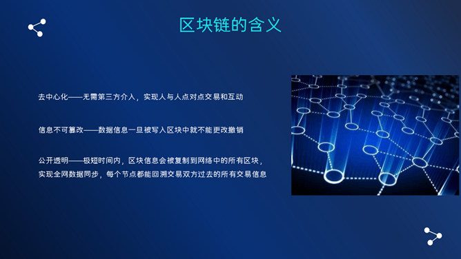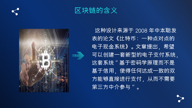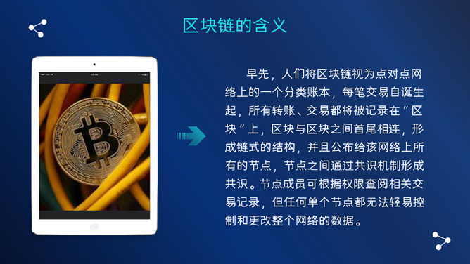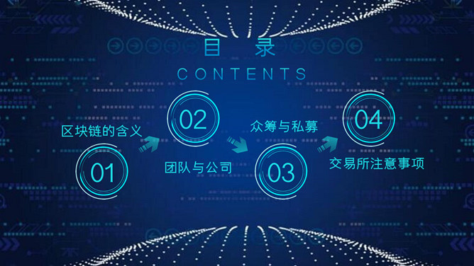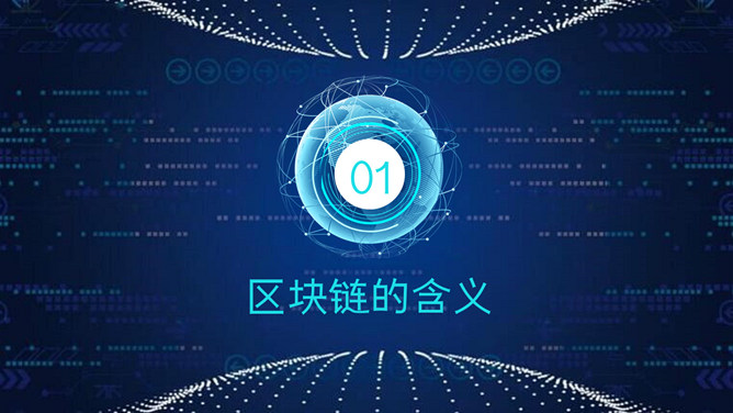 深蓝科技风区块链技术介绍PPT模板。一套科技行业相关主题幻灯片模板,适合介绍区块链相关技术及行业发展。