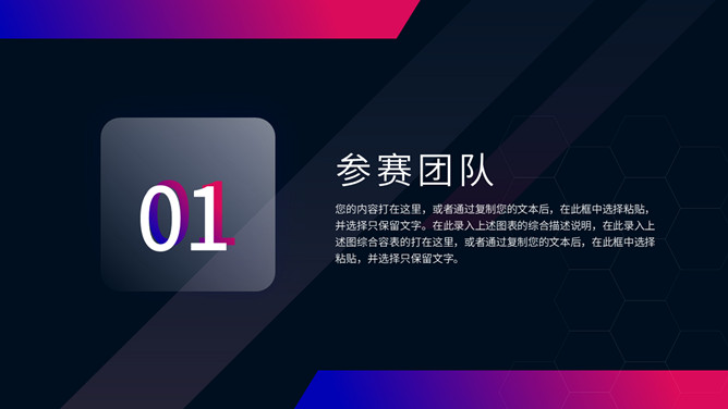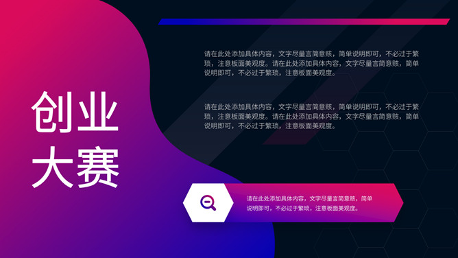 创业大赛活动策划方案PPT模板。一套创业大赛主题幻灯片模板,时尚红蓝渐变配色,适合活动策划方案总结等。