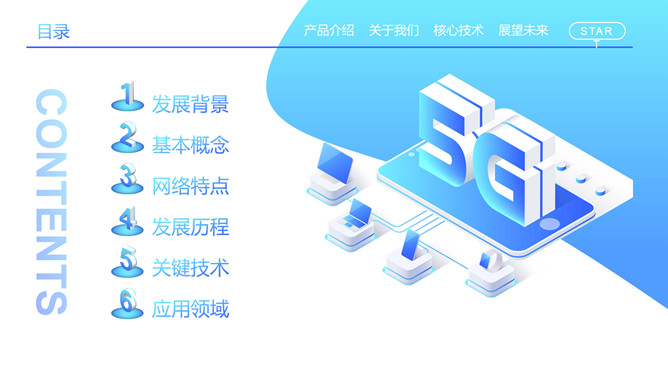 5G网络技术介绍及前景展望PPT模板。目录:发展背景、基本概念、网络特点、发展历程、关键技术应用领域。
