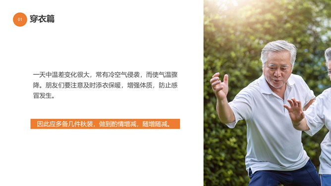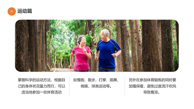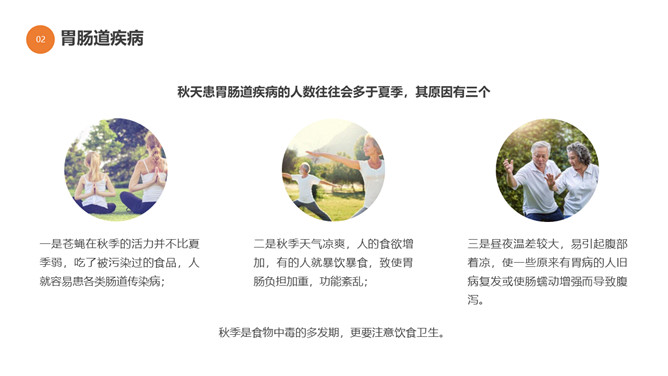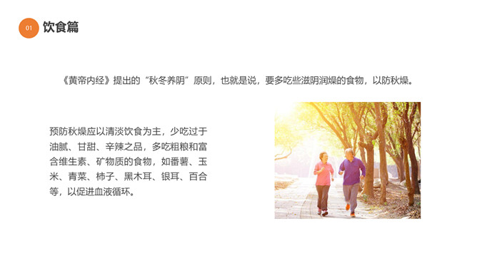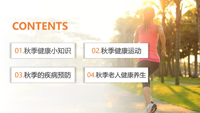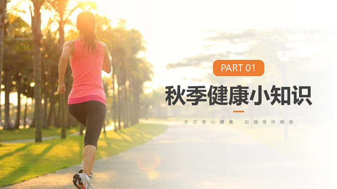 秋季健康养生知识PPT模板。目录:秋季健康小知识。秋季健康运动、秋季的疾病预防、秋季老人健康养生。