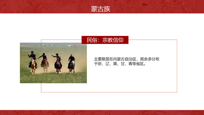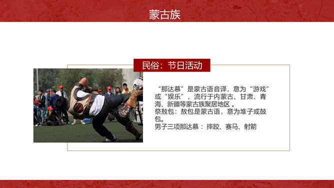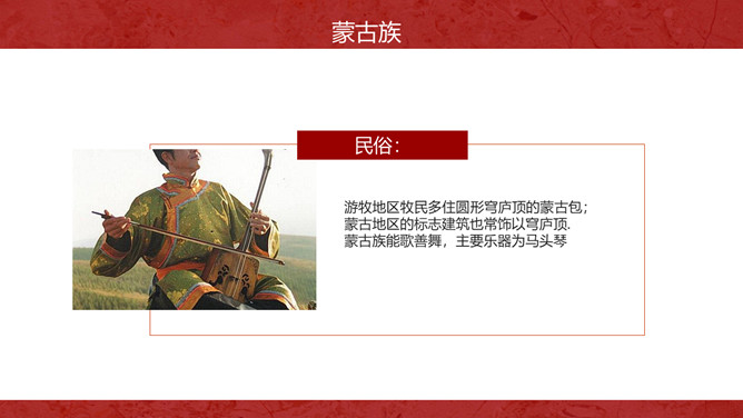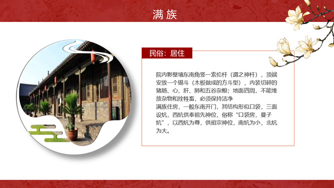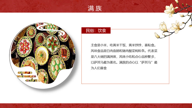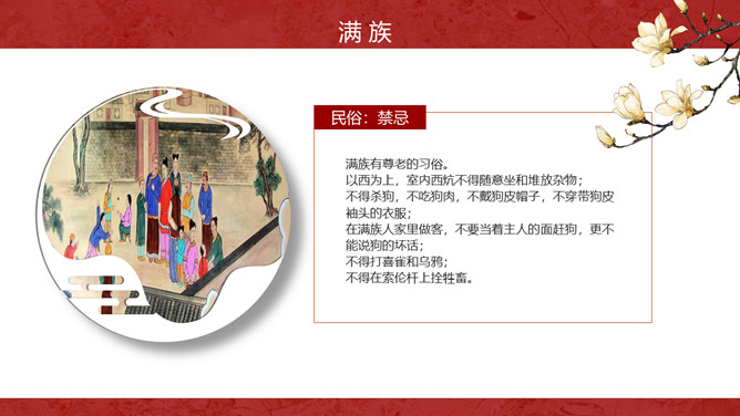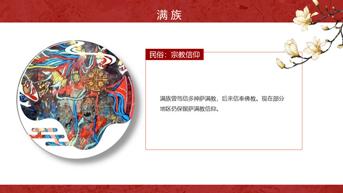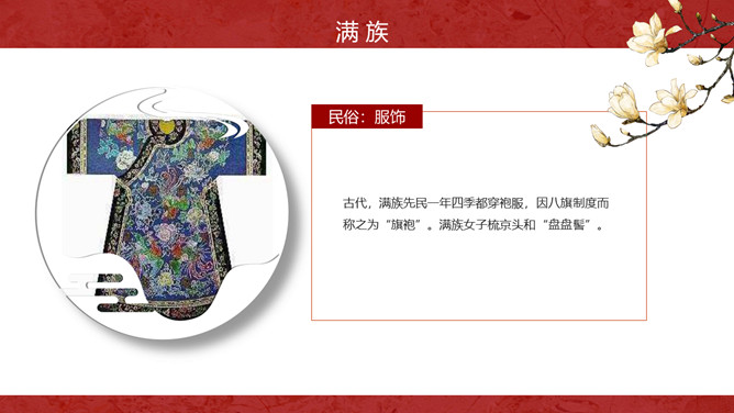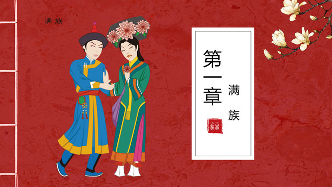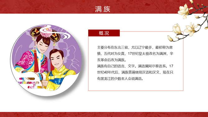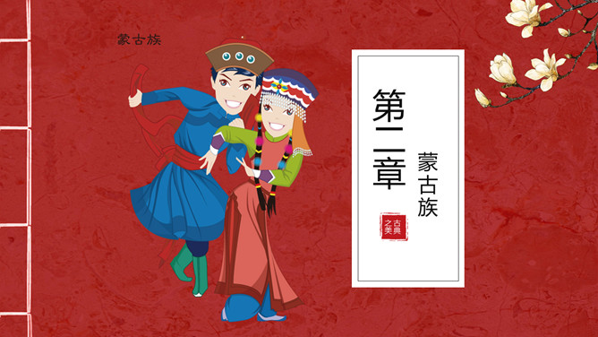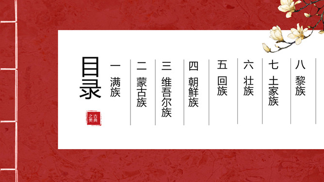 古书风格少数民族民俗介绍PPT模板。一套介绍各少数民族民俗风俗特点的幻灯片模板,线装古书风格,花卉装饰。